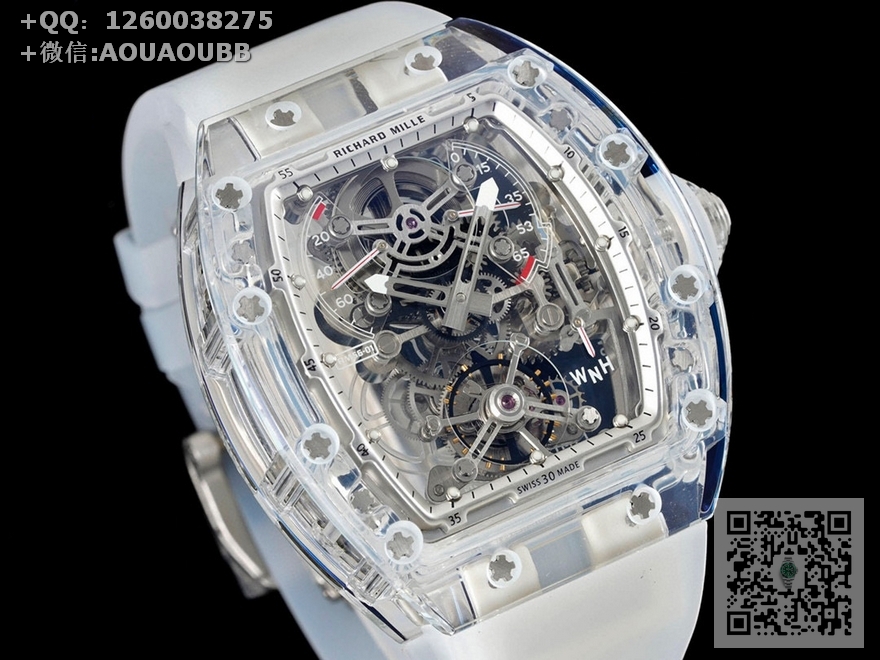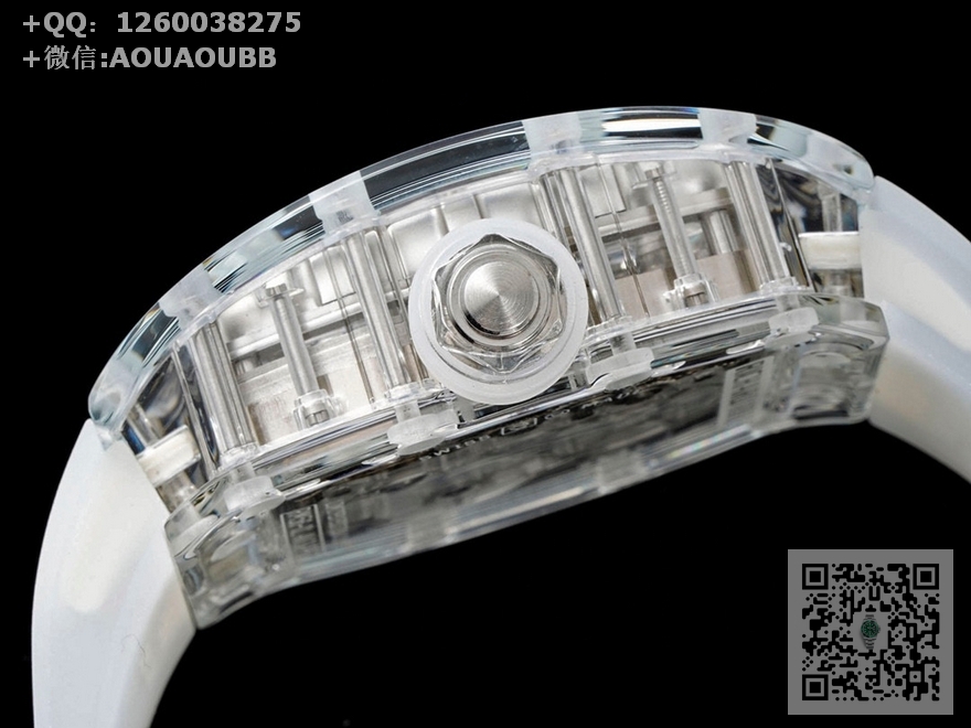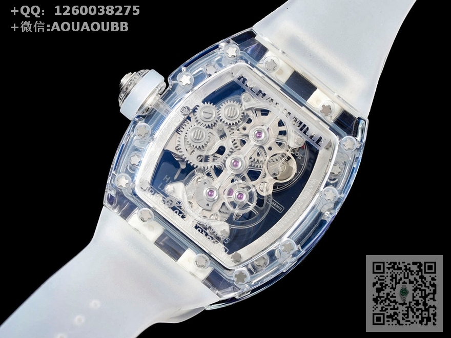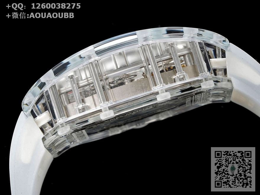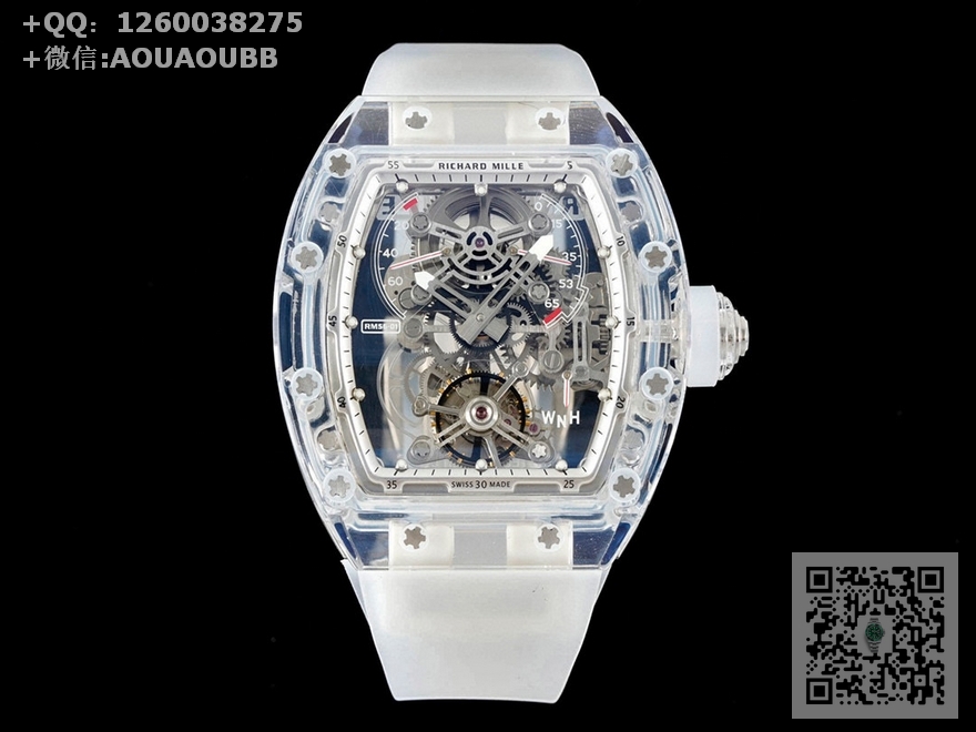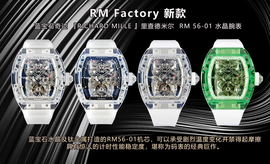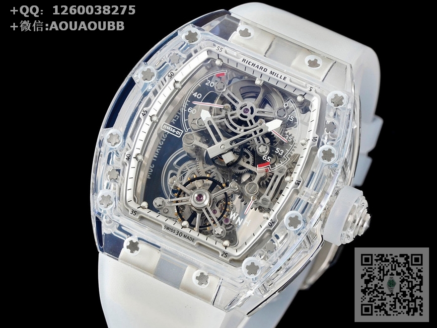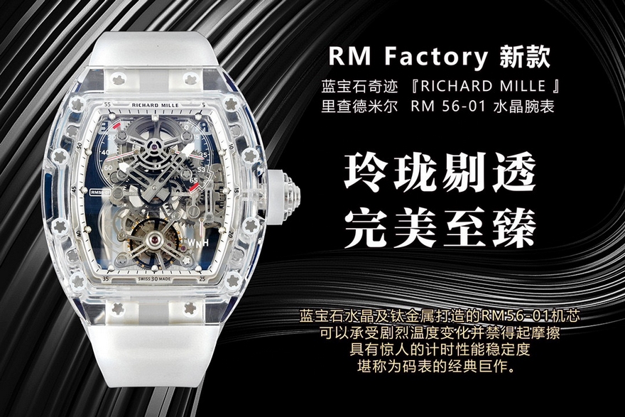 【产品介绍】RM新款 腕上建筑师  蓝宝石奇迹 『RICHARD MILLE 』里查德米尔  RM 56-01 制作一款水晶腕表,需要从每一个角度欣赏都玲珑剔透、经得起细节检验,还有什么比这更好的方式可以展示和证明制表工匠的精湛技艺呢?不止要求表壳外的部件尺寸精确,更要求腕表内部的所有螺丝和衔接都精准无比。一点点瑕疵都可以从外部清晰得见,而不管这个缺憾是多么的小。这简直可以说是制表工艺的巅峰,而RM56-01绝不会令你失望。 Richard Mille 使用一片透明的蓝宝石水晶机板来支撑整个手动上链陀飞轮机芯,为RM56-01带来了明亮动人的外观,该机芯有着小时及分钟显示,在11点钟及2点钟位置分别有动力储存显示及扭力指示器,4点钟位置则有功能选择器。这项对钛金属机芯中极致透明度的追求,也激励了表厂工程师以蓝宝石水晶打造中央桥板与第三轮的决心,中央桥板表面饰有纹路,一方面明显增加强度,一方面也让重量大大减轻。以蓝宝石水晶及钛金属打造的RM56-01机芯,可以承受剧烈温度变化并禁得起摩擦,具有惊人的计时性能稳定度,堪称为码表的经典巨作。RM56-01水晶腕表是Richard Mille表厂制作绝美透明机芯技术的完美至臻之作.对蓝宝石水晶的加工是极度艰难的顶级工艺,因此RM 56-01仅超限量发行.