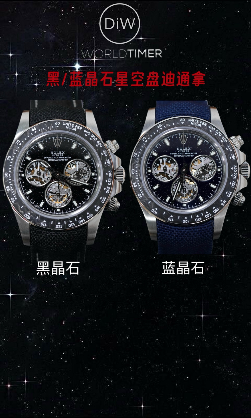 【品牌】劳力士【产品介绍】Diw 又一款震撼作品 蓝/黑晶石迪通拿,表盘由一整块天然蓝晶石加工而成(蓝晶石是一种具有高耐火度和较大高温体积膨胀的天然耐火矿物)加工难度高,成本率低。晶体表面上小点在不同光线下如同宇宙星空一样闪闪发亮。【款式】男款【尺寸】直径40mm【表带】尼龙纤维表带【镜面】蓝宝石镜面【机芯】4130机芯【防水】50米防水【配件】原装盒,说明书,质保卡,吊牌,香港机打发票【品质检测】保证所有手表实物拍摄,所见即所得 , 手表发货前都会有严格检查测试,确保您收到的手表无质量问题