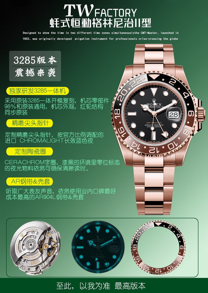 【品牌】欧米茄【产品介绍】TW厂最新顶级版本格林尼治 m126710blro-0001采用专柜机芯3285一体机芯蓝游丝和原版同样通过调试时针快跳调整日历的功能瞬跳,和原版一样的GMT双时区表针在底部时针上面的第二层,由下到上的顺序为:时针-双时区针-分钟-秒钟。本次可乐/国米圈可以说是99%以上的相似度/在各个角度均有这个99%水准。后续有详细颜色对比。本次圈口为独立开发,区别于市面上的任何版本。表盘/指针/玻璃/表壳就不再一一赘述,原装一比一开模制作,保持大厂工艺水准。TW厂一直秉承着,无原装,不开发,不达标,不出货的原则,从来不会在某个款式上,急功近利的争抢第一名出货的工厂,希望能够在表友玩表的路途上,能够做到亦师亦友,有则改之,无则加勉。【款式】男款【尺寸】直径40mm【表带】904L精钢表带【镜面】蓝宝石镜面【机芯】3285一体机芯【防水】100米【配件】原装盒,说明书,质保卡,吊牌,香港机打发票【品质检测】保证所有手表实物拍摄,所见即所得 , 手表发货前都会有严格检查测试,确保您收到的手表无质量问题