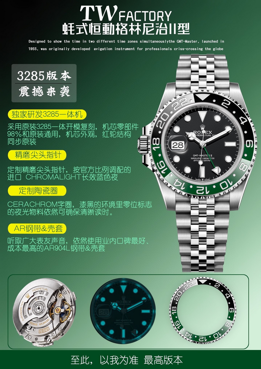 【品牌】欧米茄【产品介绍】TW厂最新顶级版本格林尼治 m126710blro-0001采用专柜机芯3285一体机芯蓝游丝和原版同样通过调试时针快跳调整日历的功能瞬跳,和原版一样的GMT双时区表针在底部时针上面的第二层,由下到上的顺序为:时针-双时区针-分钟-秒钟。本次可乐/国米圈可以说是99%以上的相似度/在各个角度均有这个99%水准。后续有详细颜色对比。本次圈口为独立开发,区别于市面上的任何版本。表盘/指针/玻璃/表壳就不再一一赘述,原装一比一开模制作,保持大厂工艺水准。TW厂一直秉承着,无原装,不开发,不达标,不出货的原则,从来不会在某个款式上,急功近利的争抢第一名出货的工厂,希望能够在表友玩表的路途上,能够做到亦师亦友,有则改之,无则加勉。【款式】男款【尺寸】直径40mm【表带】904L精钢表带【镜面】蓝宝石镜面【机芯】3285一体机芯【防水】100米【配件】原装盒,说明书,质保卡,吊牌,香港机打发票【品质检测】保证所有手表实物拍摄,所见即所得 , 手表发货前都会有严格检查测试,确保您收到的手表无质量问题