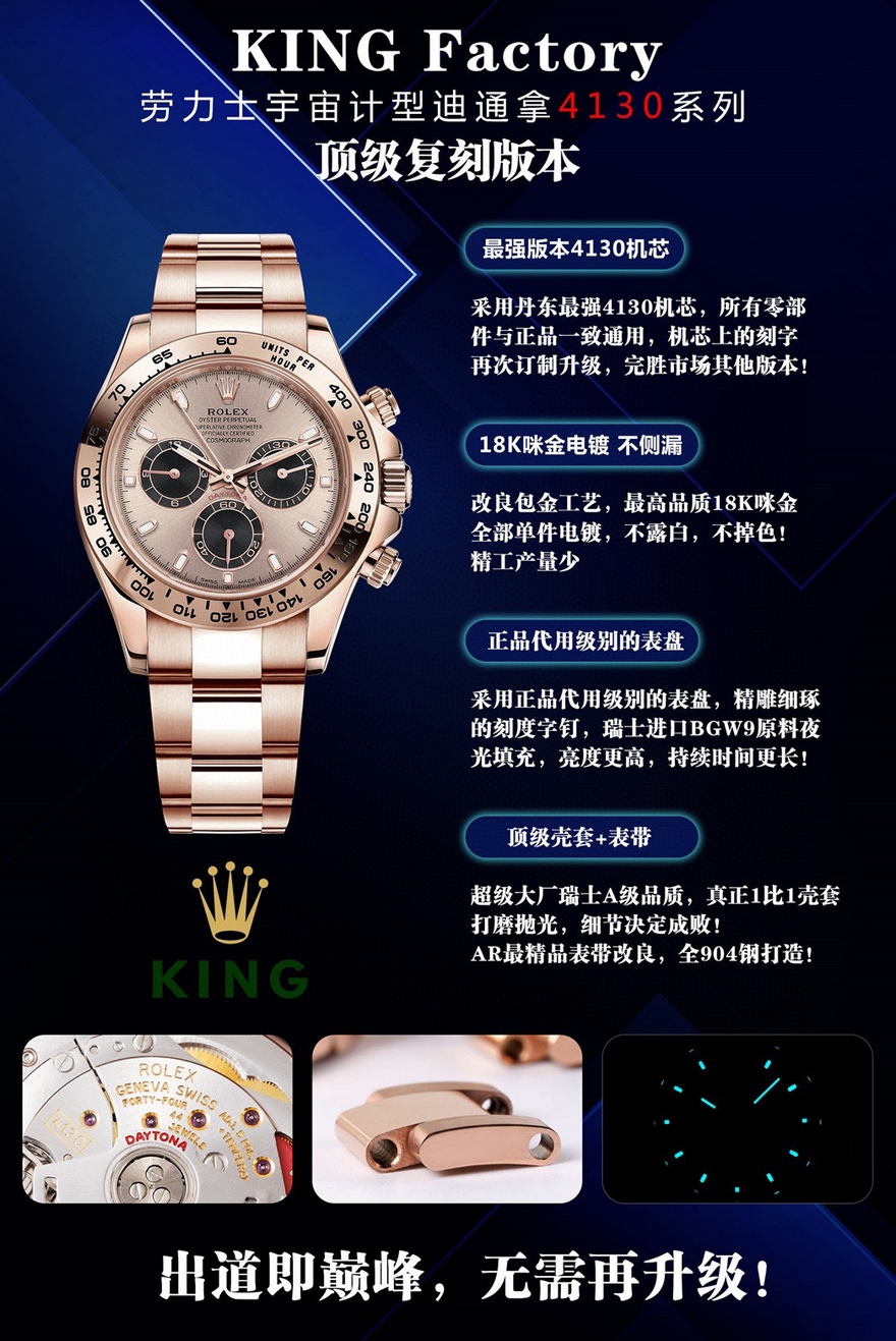 【品牌】劳力士【产品介绍】KING ROLEX DAYTONA 4130版本出道即巅峰!无须再升级!超级精品!欢迎品鉴!超级大厂 瑞士A级品质 !真正原装1比1壳套打磨抛光!尺寸:40mm*12.2mm采用最好的代用级别表盘和夜光指针搭载最强丹东4130机芯!机芯夹板雕刻字体升级!圈口升级!秒杀市场其它版本!AR精品全904L表带,不惜成本重金打造间金,全金,全玫瑰金款,采用包金式的18K金电镀工艺,是目前国内最好的单件散电!不透白,不掉色!成本极高,产量不多!KING 劳力士 迪通拿以超绝的品质 满满的诚意 值得您拥有【款式】男款【尺寸】直径40mm厚度12.2mm【表带】904L精钢表带【镜面】蓝宝石镜面【机芯】4130一体机芯【防水】100米防水【配件】原装盒,说明书,质保卡,吊牌,香港机打发票【品质检测】保证所有手表实物拍摄,所见即所得 , 手表发货前都会有严格检查测试,确保您收到的手表无质量问题