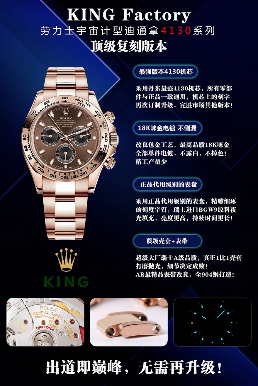 【品牌】劳力士【产品介绍】KING ROLEX DAYTONA 4130版本出道即巅峰!无须再升级!超级精品!欢迎品鉴!超级大厂 瑞士A级品质 !真正原装1比1壳套打磨抛光!尺寸:40mm*12.2mm采用最好的代用级别表盘和夜光指针搭载最强丹东4130机芯!机芯夹板雕刻字体升级!圈口升级!秒杀市场其它版本!AR精品全904L表带,不惜成本重金打造间金,全金,全玫瑰金款,采用包金式的18K金电镀工艺,是目前国内最好的单件散电!不透白,不掉色!成本极高,产量不多!KING 劳力士 迪通拿以超绝的品质 满满的诚意 值得您拥有【款式】男款【尺寸】直径40mm厚度12.2mm【表带】904L精钢表带【镜面】蓝宝石镜面【机芯】4130一体机芯【防水】100米防水【配件】原装盒,说明书,质保卡,吊牌,香港机打发票【品质检测】保证所有手表实物拍摄,所见即所得 , 手表发货前都会有严格检查测试,确保您收到的手表无质量问题