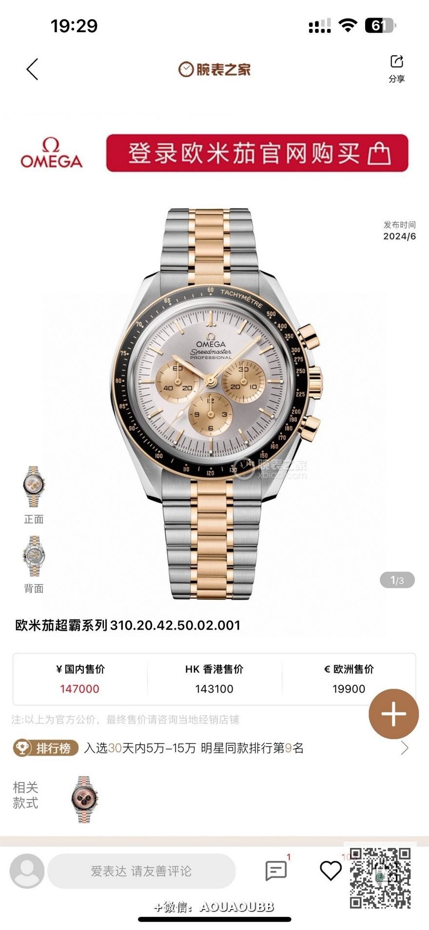 【产品介绍】欧米茄 OMEGA 超霸系列3861月球表 间金款 310.20.42.50.02.001 42毫米的表壳直径搭配太阳射线打磨效果的阶梯式表盘,设有经黑化处理的小表盘和小时刻度,呈现出别具一格的视觉冲击力,黑色陶瓷表圈饰以由OMEGA Ceragold技术制成的测速刻度, 并设有早期超霸表款标志性的“Dot over 90”  标记。内部搭载的3861至臻天文台机芯,高精准度和防磁能力,还拥有令人赞叹的机芯打磨工艺, 奢华与精准的结合其独特的设计和卓越的性能,成为钟表收藏家与太空迷们梦寐以求的时计。