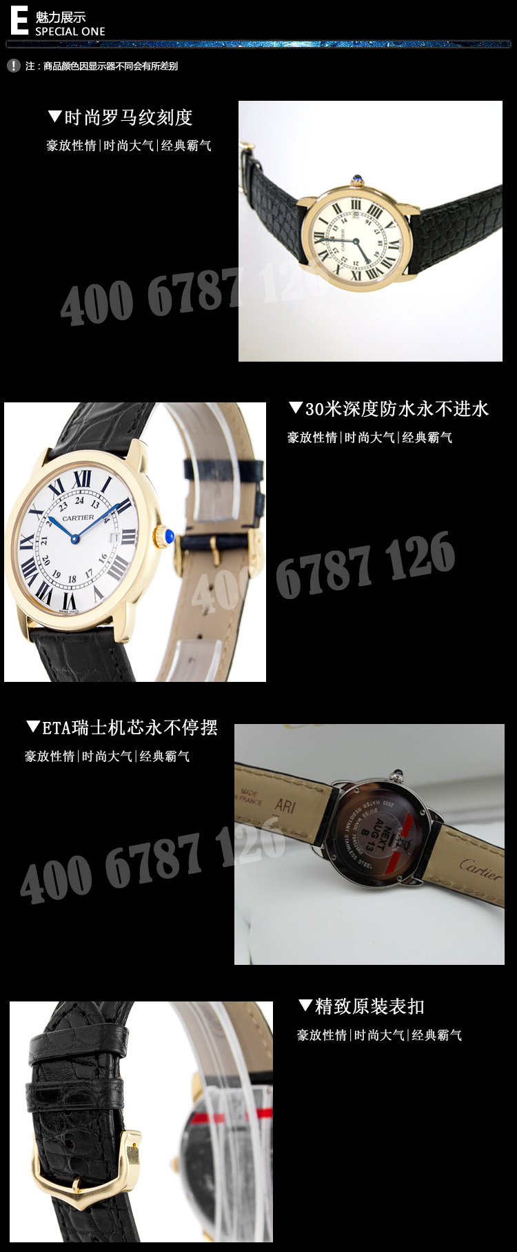 退换货:本商城提供7天包退,15天包换服务。退换货的前提是手表无任何损花佩戴,千万不要拆卸表带,所退换商品要求具备商品收到时完整的外包装、配件、吊牌等不影响2次销售的。办理的话直接联系微信客服登记处理。4、手表防水注意事项