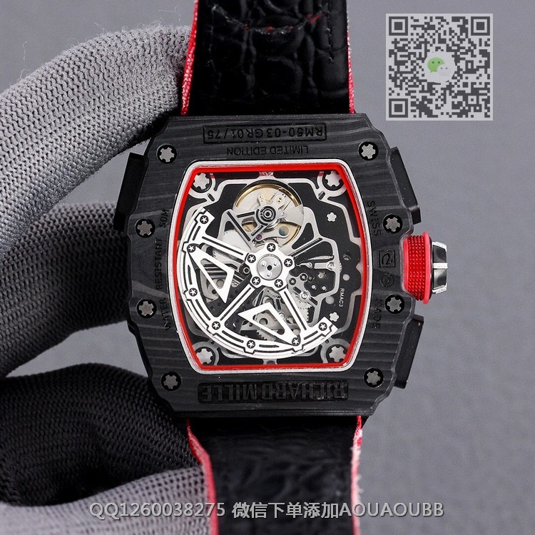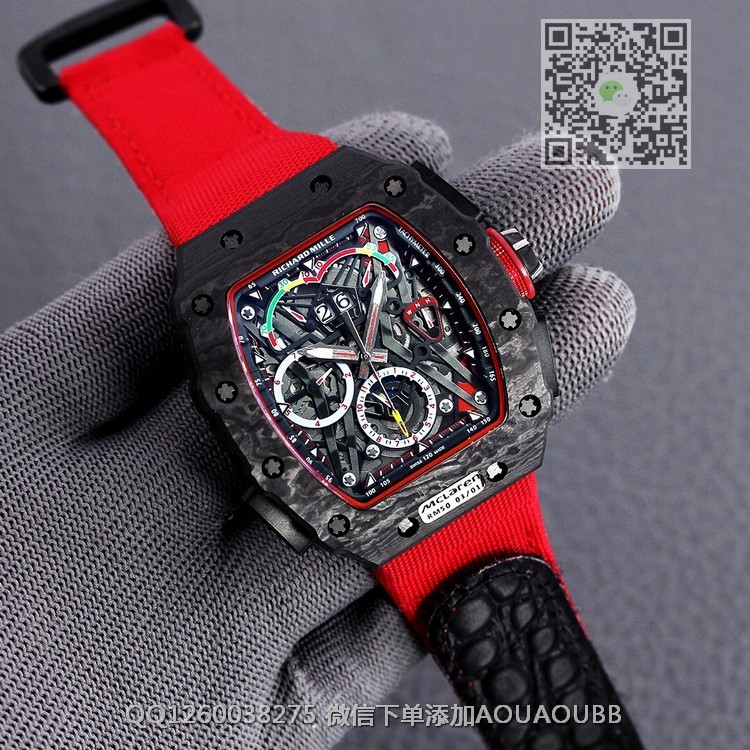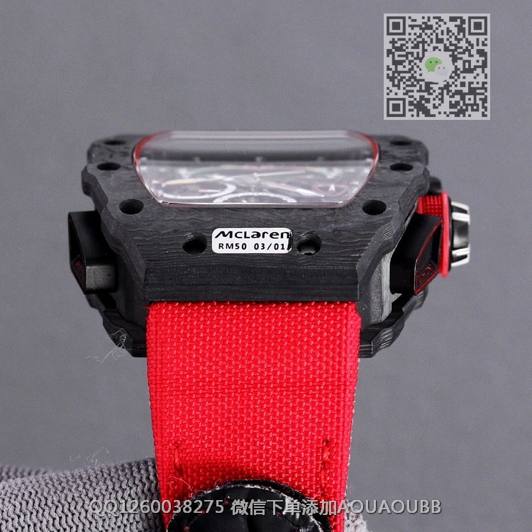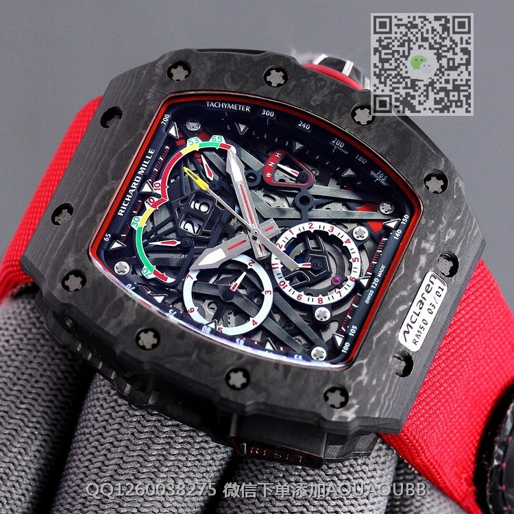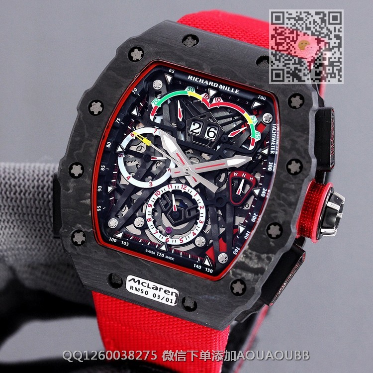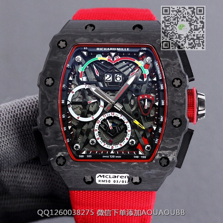 【品牌】理查德米勒【产品介绍】RichardMille理查德•米勒 (腕表型号: RM50-03,迈凯轮)艺术提升了全新层次,顶级碳纤维壳套 完美的纹路 顶级的做工!搭载大日历多功能全自动机械机芯,进口橡胶表带原装鑫折叠扣,尺寸50X40mm展现着理查品牌的高端与经典!品质选择!【款式】男款【尺寸】50X40mm【表带】尼龙纤维表带【镜面】蓝宝石镜面【机芯】复刻正品机芯【防水】50米防水【配件】原装盒,说明书,质保卡,吊牌,香港机打发票【品质检测】保证所有手表实物拍摄,所见即所得 , 手表发货前都会有严格检查测试,确保您收到的手表无质量问题