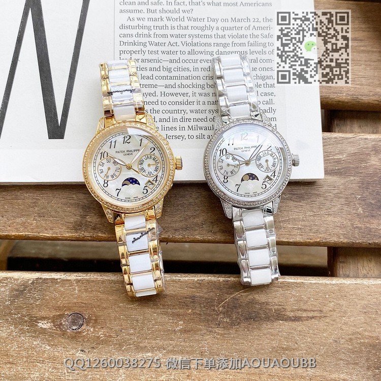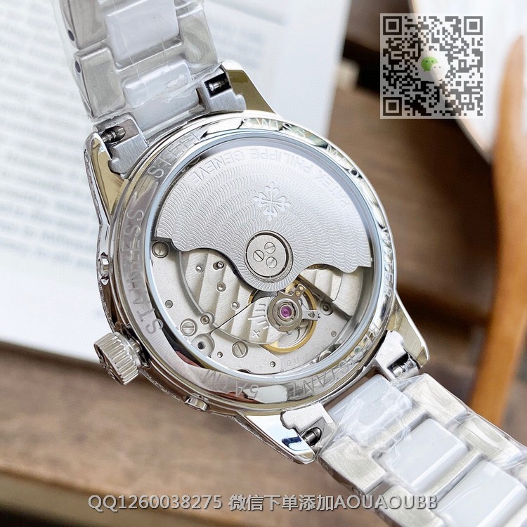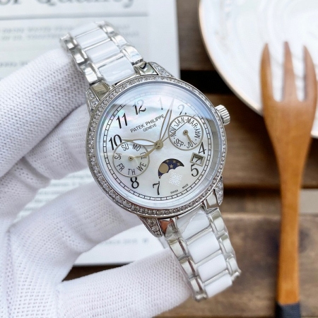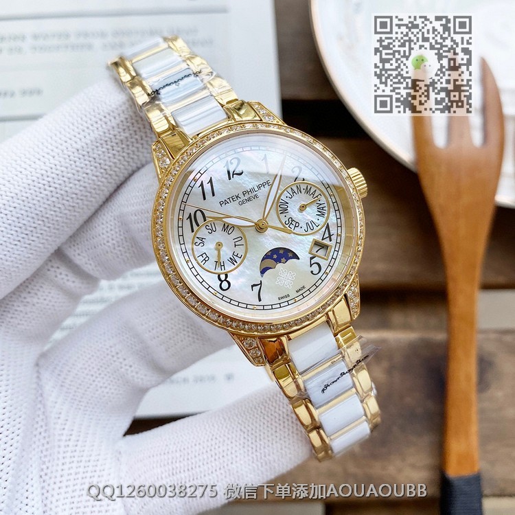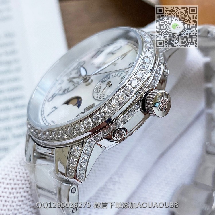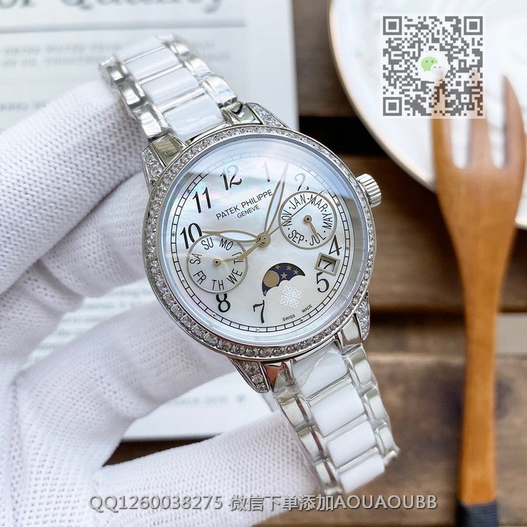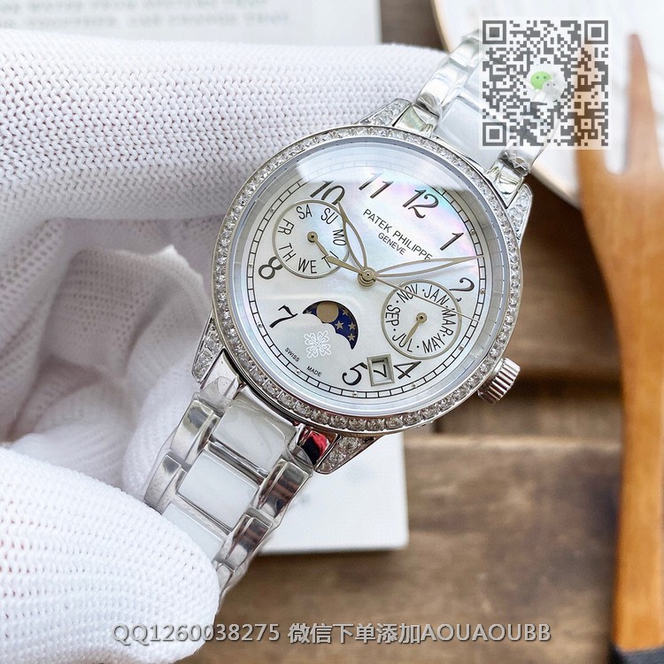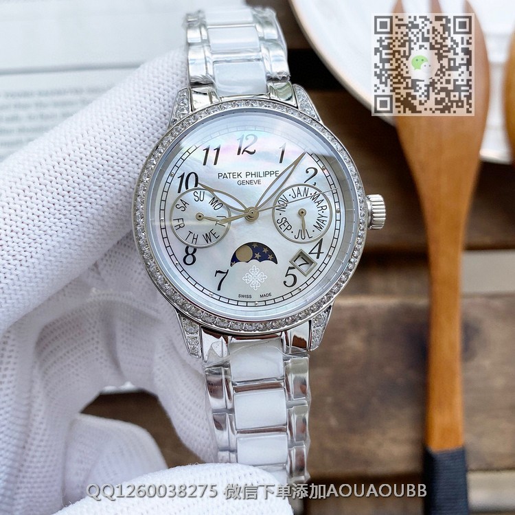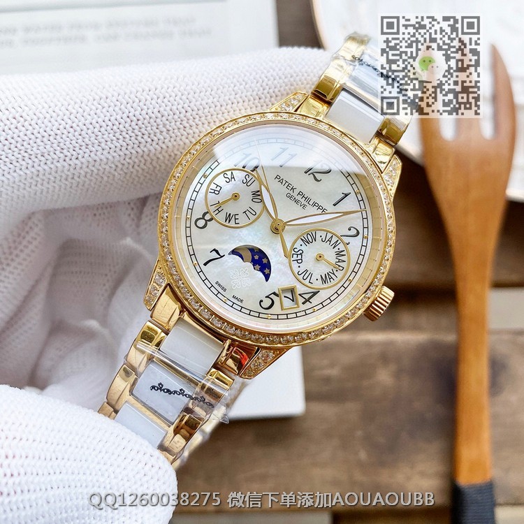 【产品介绍】百达翡丽4937万年历女式腕表,极致优雅风范搭配进口9100多功能机芯(零返修)功能(24小时,星期/星辰/月份)此腕表拥有48小时动力储备.进口316L精钢,采用18k品质炉内真空电镀!搭配间陶瓷精钢表带,也可以换成皮带,颜色可选(白/红/黑/棕/蓝,5色任选)可随意搭配!加18k电镀原装扣 尺寸:35×10mm.耐磨防刮蓝宝石玻璃镜面!