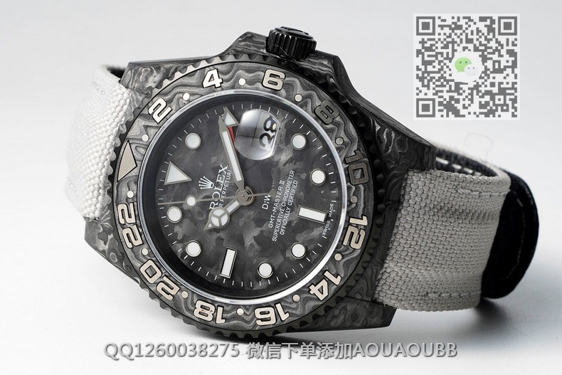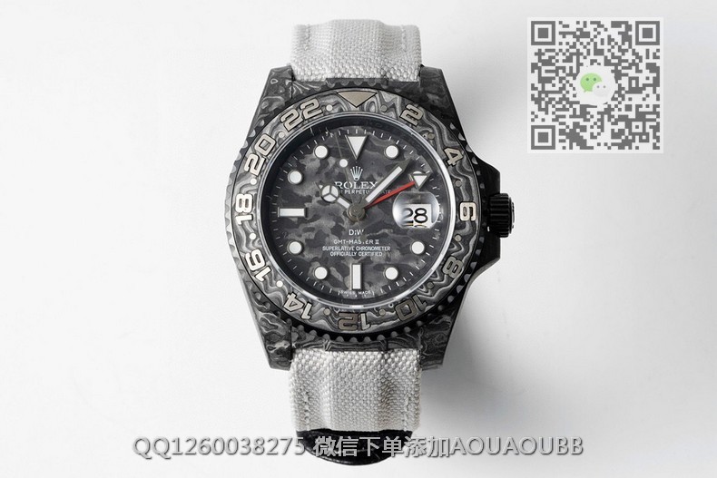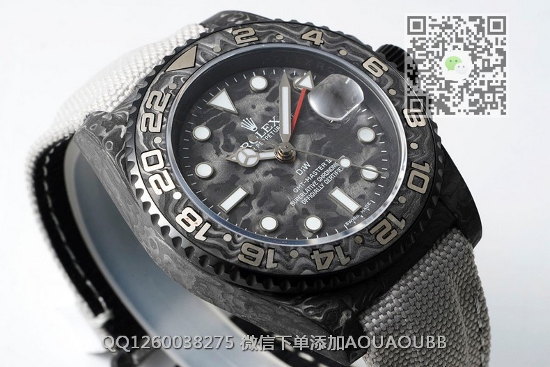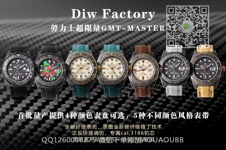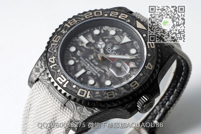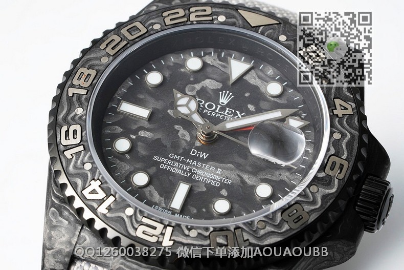 【品牌】劳力士【产品介绍】Diw新作勞力士超限量GMT-MASTER II——堪称历来最轻的一款GMT-Master IIDiw为GMT-Master II重新制作了碳纤维表壳,同时包含表圈、面盘等零件也全都是碳纤维材质,除了有碳纤维独特的不规则纹理之外,其中碳纤维表圈上数字刻度首次采用全新碳纤维植丁技术(非填油)塑造丰富视觉层次,质感细腻。透视底盖可清楚展示正反快速调日历的劳力士专属cal.3186机芯。搭配柔软魔术贴表带和一体碳纤维表扣,在超轻碳纤维与织物表带舒适性的交织下,提升了手表整体的佩戴体验。首批量产提供4种颜色表盘可选,5种不同颜色风格表带。【款式】男款【尺寸】直径40mm【表带】绢织表带【镜面】蓝宝石镜面【机芯】cal.3186一体机 复刻劳力士正品机型【防水】100米防水【配件】原装盒,说明书,质保卡,吊牌,香港机打发票【品质检测】保证所有手表实物拍摄,所见即所得 , 手表发货前都会有严格检查测试,确保您收到的手表无质量问题