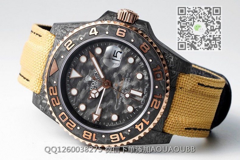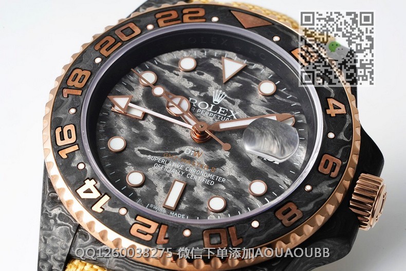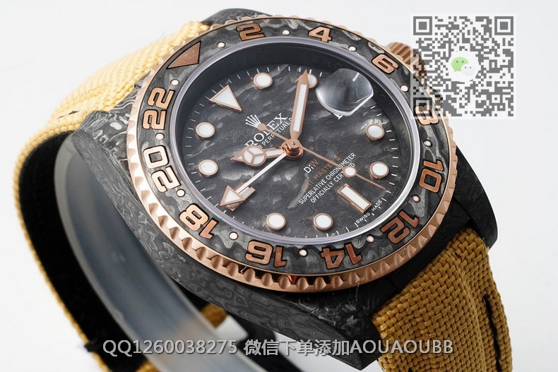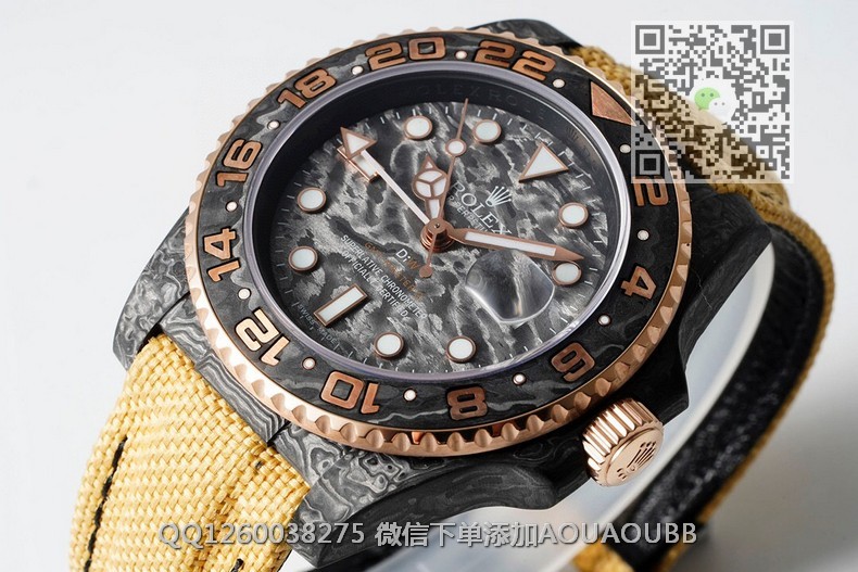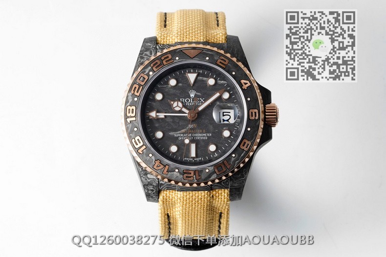 【品牌】劳力士【产品介绍】Diw新作勞力士超限量GMT-MASTER II——堪称历来最轻的一款GMT-Master IIDiw为GMT-Master II重新制作了碳纤维表壳,同时包含表圈、面盘等零件也全都是碳纤维材质,除了有碳纤维独特的不规则纹理之外,其中碳纤维表圈上数字刻度首次采用全新碳纤维植丁技术(非填油)塑造丰富视觉层次,质感细腻。透视底盖可清楚展示正反快速调日历的劳力士专属cal.3186机芯。搭配柔软魔术贴表带和一体碳纤维表扣,在超轻碳纤维与织物表带舒适性的交织下,提升了手表整体的佩戴体验。首批量产提供4种颜色表盘可选,5种不同颜色风格表带。【款式】男款【尺寸】直径40mm【表带】绢织表带【镜面】蓝宝石镜面【机芯】cal.3186一体机 复刻劳力士正品机型【防水】100米防水【配件】原装盒,说明书,质保卡,吊牌,香港机打发票【品质检测】保证所有手表实物拍摄,所见即所得 , 手表发货前都会有严格检查测试,确保您收到的手表无质量问题