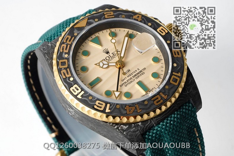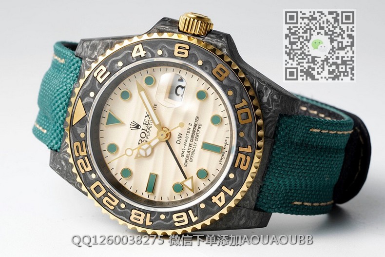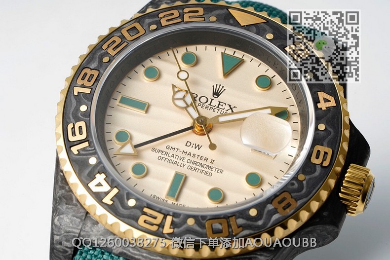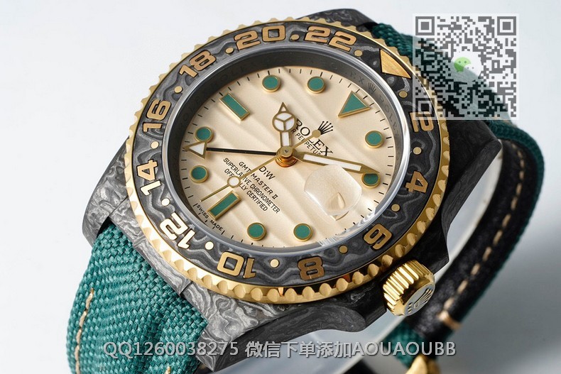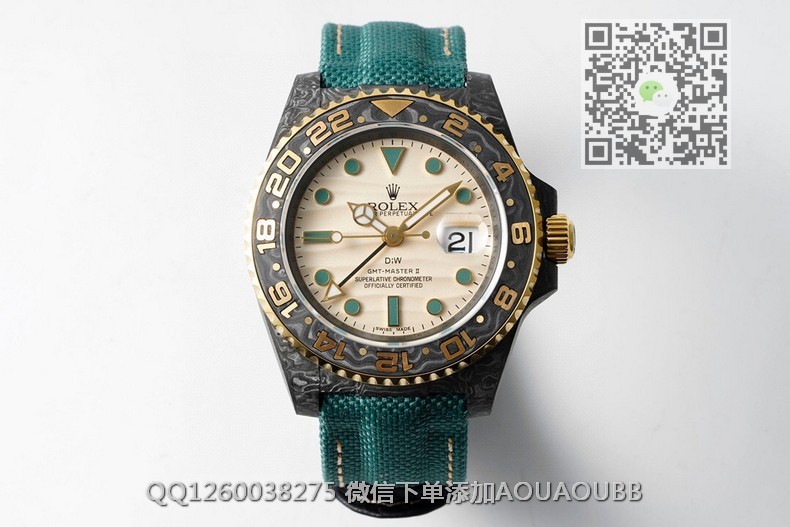 【品牌】劳力士【产品介绍】Diw新作勞力士超限量GMT-MASTER II——堪称历来最轻的一款GMT-Master IIDiw为GMT-Master II重新制作了碳纤维表壳,同时包含表圈、面盘等零件也全都是碳纤维材质,除了有碳纤维独特的不规则纹理之外,其中碳纤维表圈上数字刻度首次采用全新碳纤维植丁技术(非填油)塑造丰富视觉层次,质感细腻。透视底盖可清楚展示正反快速调日历的劳力士专属cal.3186机芯。搭配柔软魔术贴表带和一体碳纤维表扣,在超轻碳纤维与织物表带舒适性的交织下,提升了手表整体的佩戴体验。首批量产提供4种颜色表盘可选,5种不同颜色风格表带。【款式】男款【尺寸】直径40mm【表带】绢织表带【镜面】蓝宝石镜面【机芯】cal.3186一体机 复刻劳力士正品机型【防水】100米防水【配件】原装盒,说明书,质保卡,吊牌,香港机打发票【品质检测】保证所有手表实物拍摄,所见即所得 , 手表发货前都会有严格检查测试,确保您收到的手表无质量问题