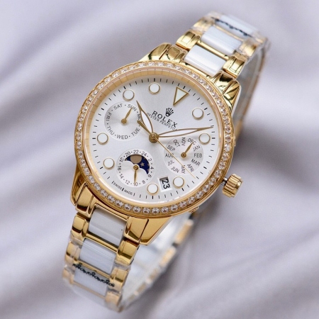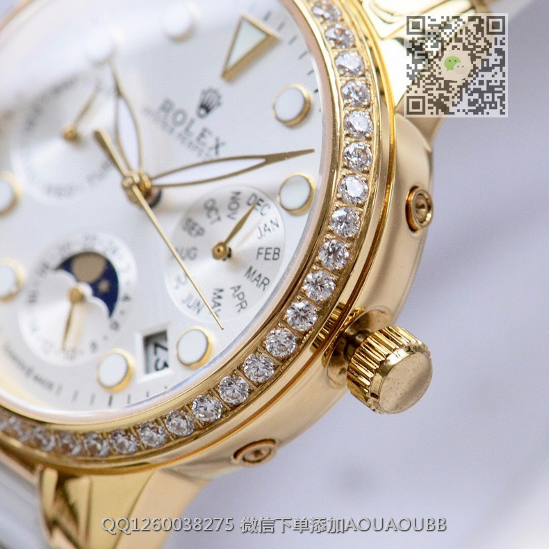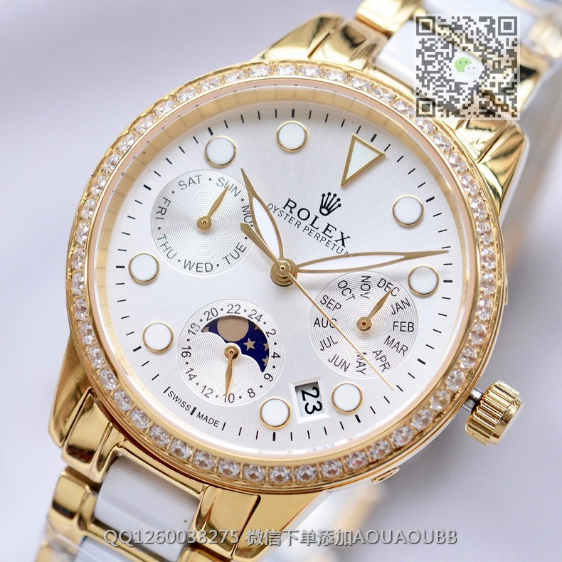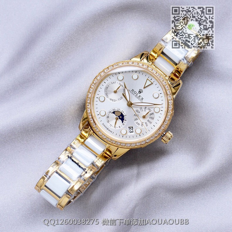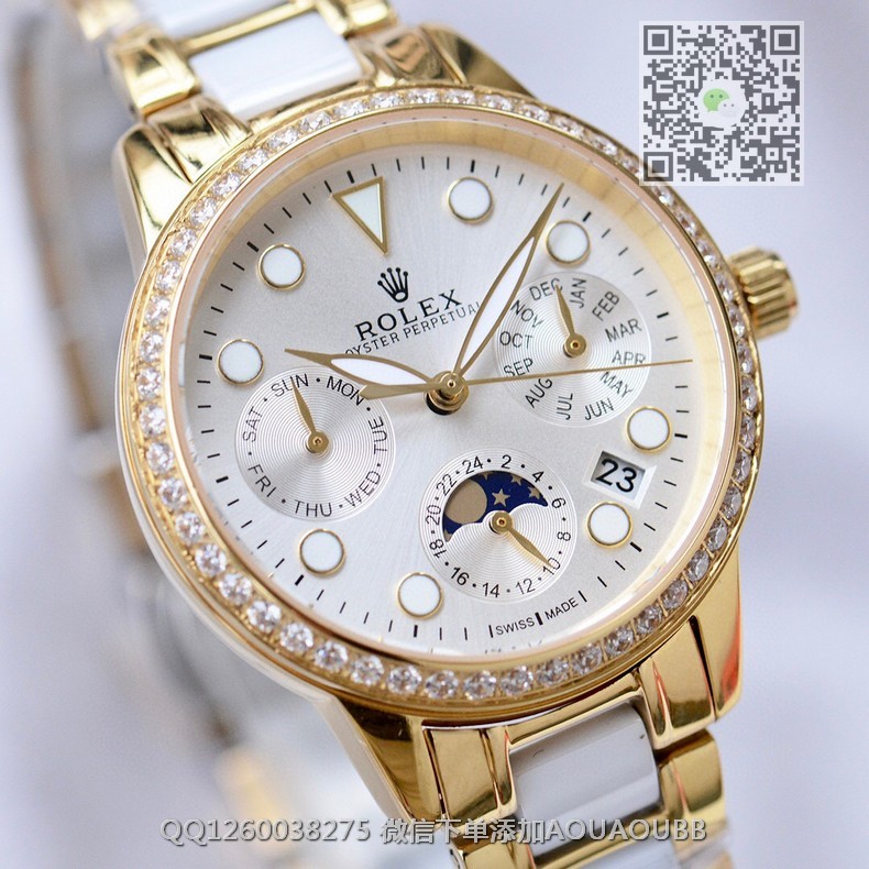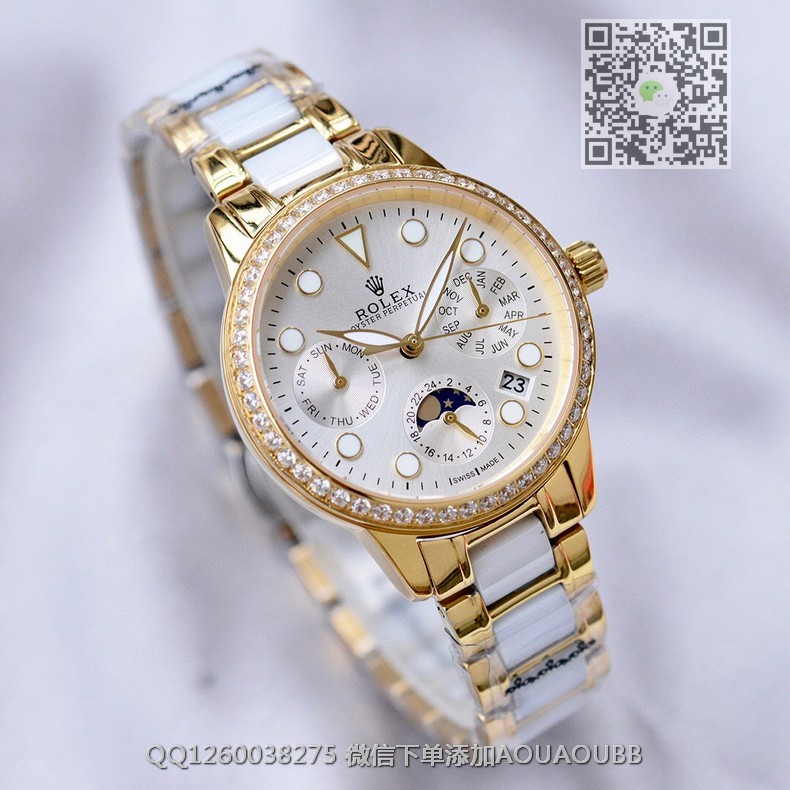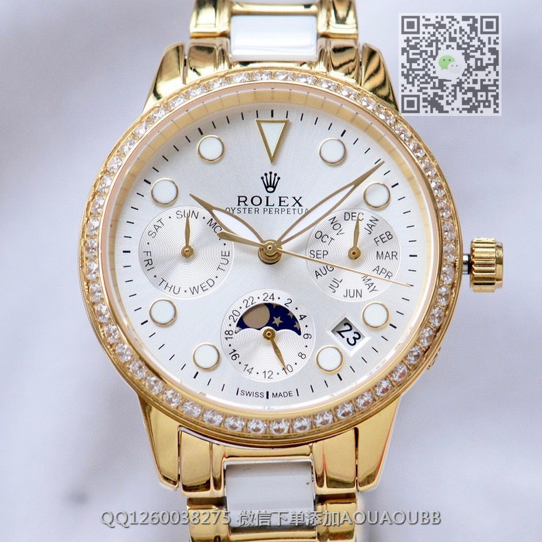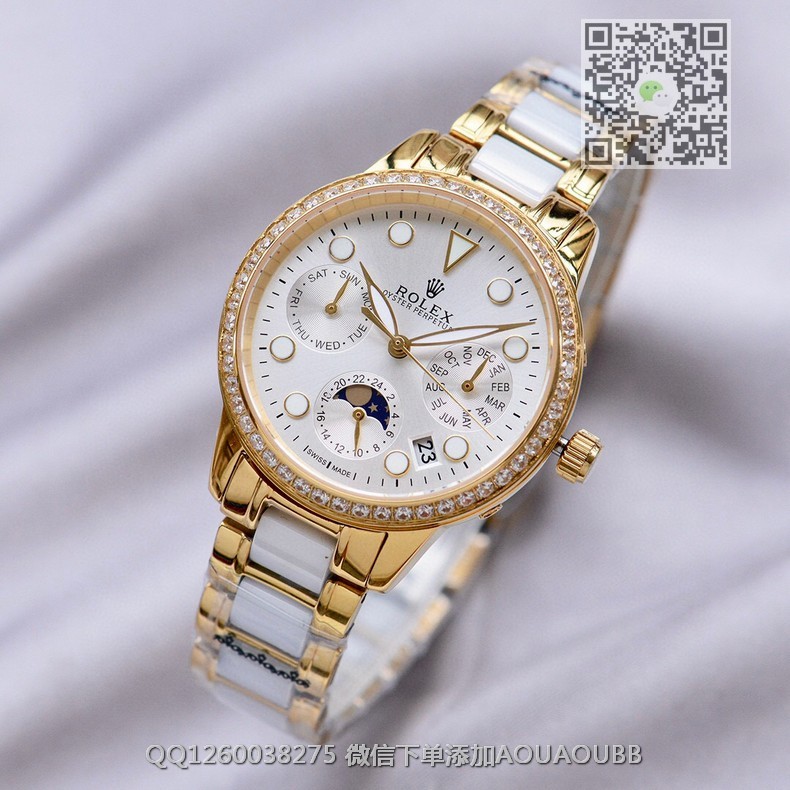 【品牌】劳力士【产品介绍】劳力士 -复杂功能计时系列上市 ROLEX 小红书爆款多功能腕表正式上市!搭载原装进口9100月相功能机芯机械表走时精准零返修!表盘上采用罗马施华洛水钻作为刻度更显示出这款腕表的华贵气质!皮带采用进口方形鳞纹牛皮表带,表镜采用蓝宝石镜面,透视底盖!女款35毫米,厚度10毫米!腕表功能汇集星期/月份/日期等功能于一身,最佳女腕表真正的富家女标配!为高端腕表的代表之作尊贵彰显之美誉细节之处透露女士高贵,品位十分!实物拍摄品质如一!【款式】女款【尺寸】35mmx10mm【表带】陶瓷钢带/意大利精选小牛皮【镜面】蓝宝石镜面【机芯】原装进口9100机械机芯【防水】50米防水【配件】原装盒,说明书,质保卡,吊牌,香港机打发票【品质检测】保证所有手表实物拍摄,所见即所得 , 手表发货前都会有严格检查测试,确保您收到的手表无质量问题