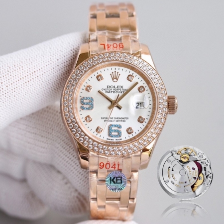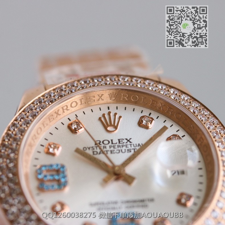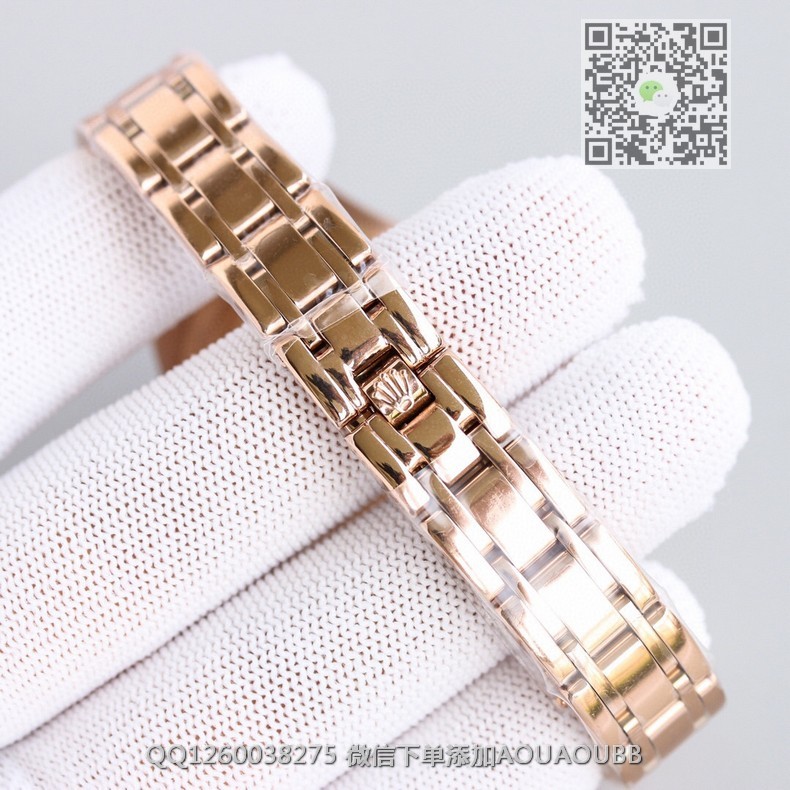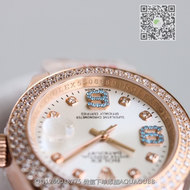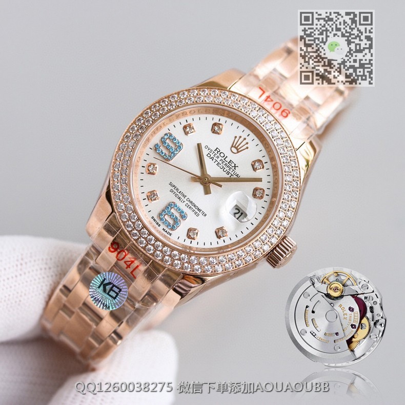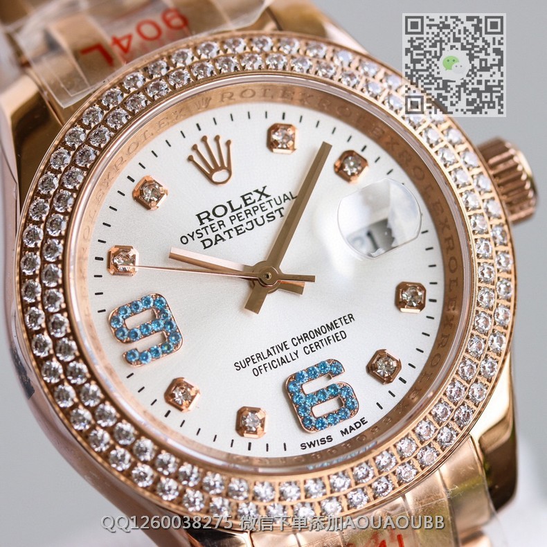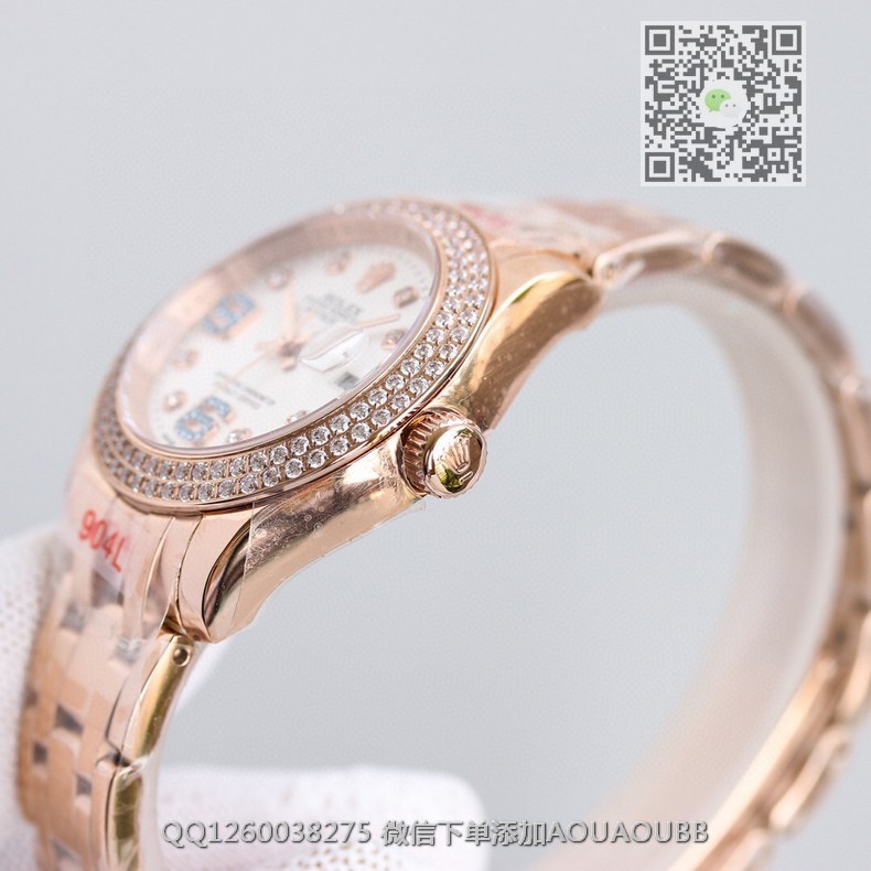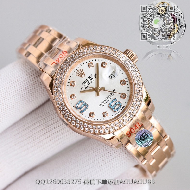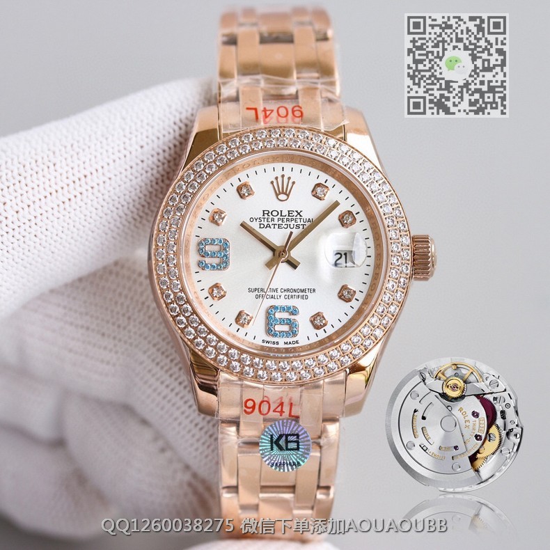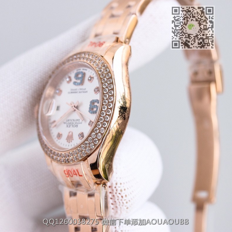 【品牌】劳力士【产品介绍】劳力士-34毫米 镶钻表盘PEARLMASTER系列①:女装珍珠淑女型采用904L不锈钢来锻造不锈钢腕表,表壳具备高抗腐蚀性。这种超合金不仅非常耐用且易于磨光,即使在最极端的环境,其美态依然不减。②:内置装配Cal.2236自动机械 性能极为稳定,其抗震力、几何结构使机芯在任何位置都可保持规律运行。③:三角坑纹底盖以专用工具旋紧使表壳安全密封上链表冠采用双扣锁双重防水系统,牢固旋紧于表壳,使得更加防水。④:镜面则以抗刮损蓝水晶制造,3点钟位置装有小窗凸透镜,方便读取日期。女装珍珠淑女型的防水蚝式表壳给予高精准机芯最佳防护。⑤:腕表表带和外圈底下的崭新隐蔽连接方式,确保表带和表壳之间达到无缝连接的视觉效果。重新设计的纪念型表带配有新一代隐蔽式皇冠带扣,以较接的劳力士皇冠标志开启。【款式】女款【尺寸】直径34mm【表带】精钢表带【镜面】蓝宝石镜面【机芯】Cal.2236机芯【防水】100米防水【配件】原装盒,说明书,质保卡,吊牌,香港机打发票【品质检测】保证所有手表实物拍摄,所见即所得 , 手表发货前都会有严格检查测试,确保您收到的手表无质量问题