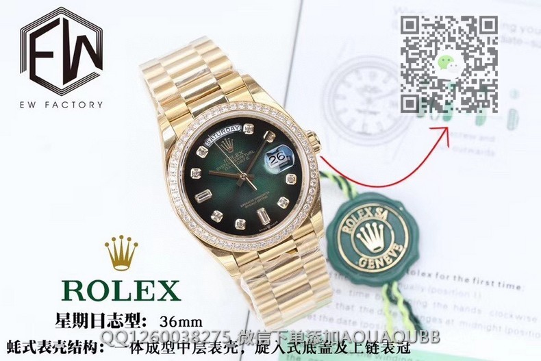 【产品介绍】2021新品,EW劳力士星期日志型36,表盘设有18ct金,镶钻石,69点钟位置镶方形钻石。蚝式表壳结构,一体中层表壳,旋入式底盖及上链表冠。结构尺寸厚度同步原装,直径36毫米,厚度为12毫米。