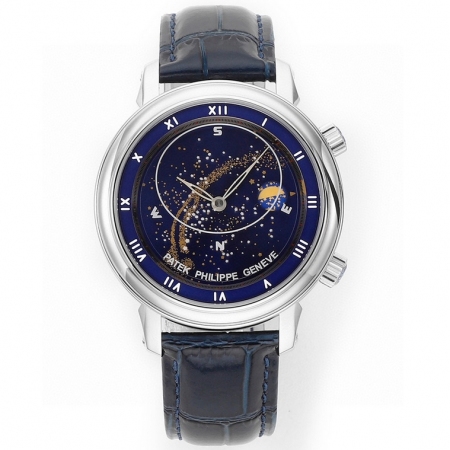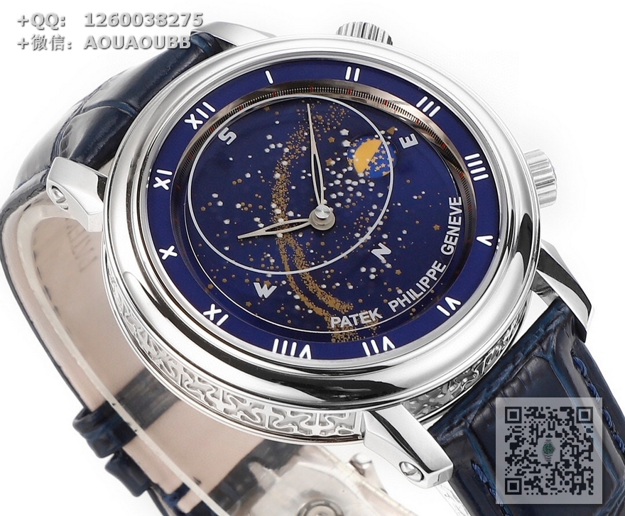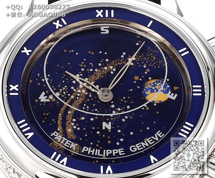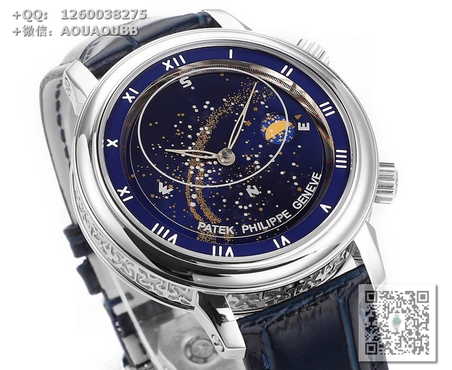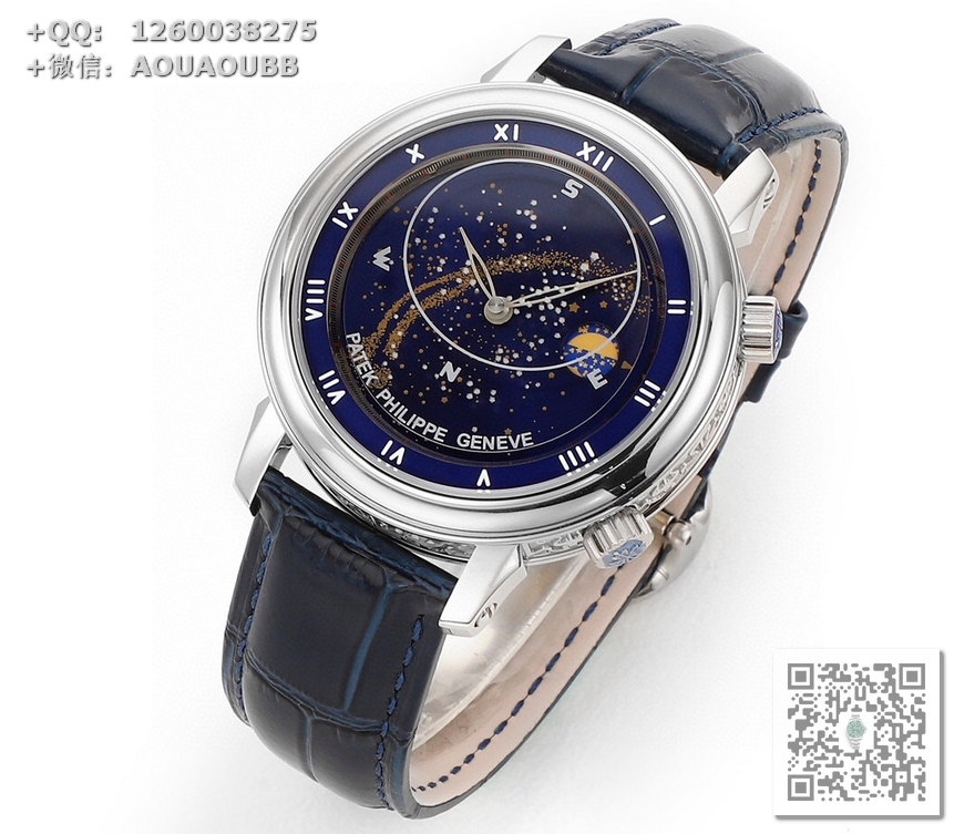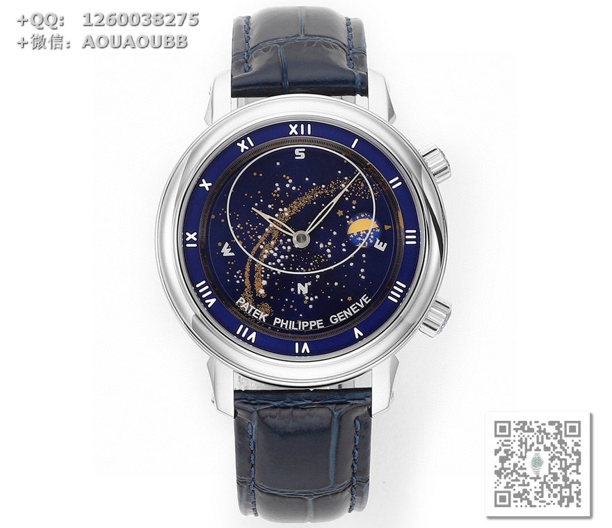 升级日历的排法和正品一样的顺序 整个手表的厚度更加接近正品的厚度42*11 mm 百达翡丽星空里的月亮会根据天空上的月亮变化 而变化根据天空上的月圆月缺搬(初一月弯弯初十五月圆)到手表上了 加强了超级夜光 整个表面夜光满满的