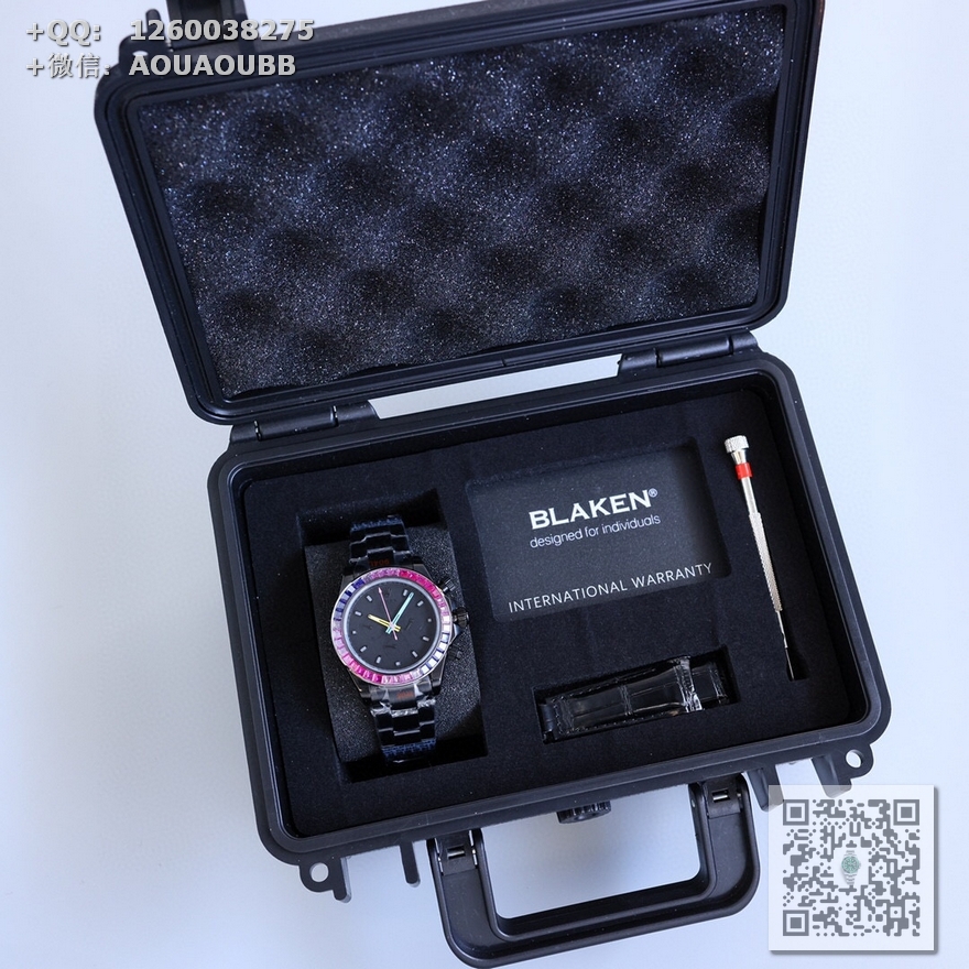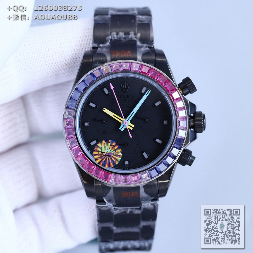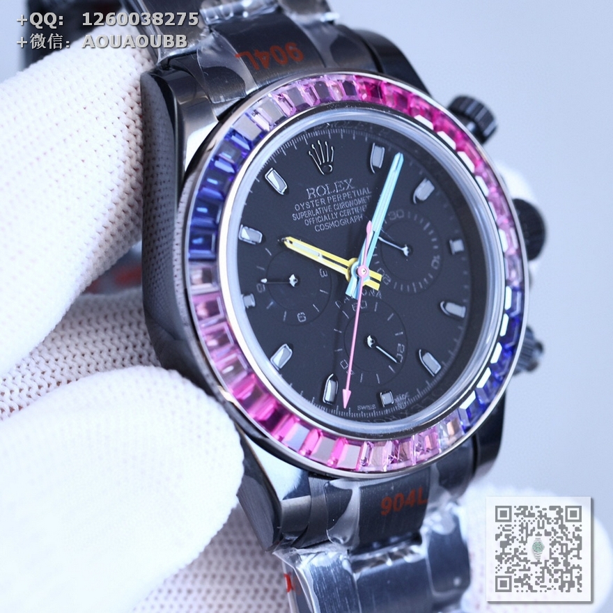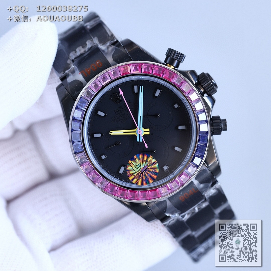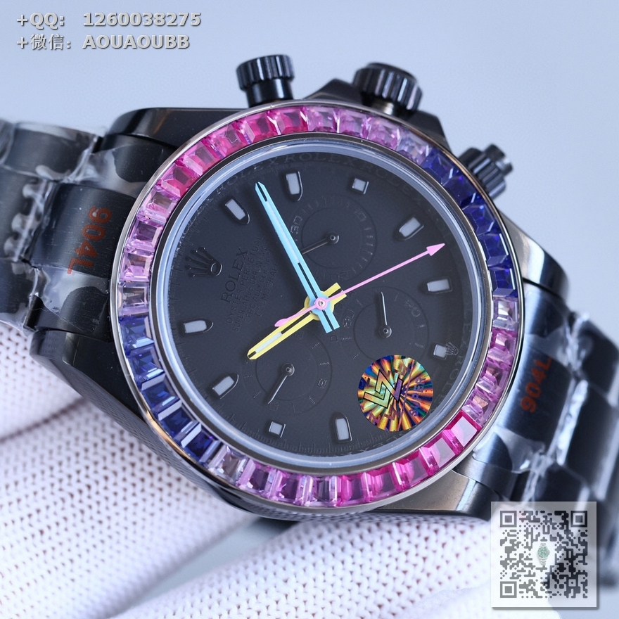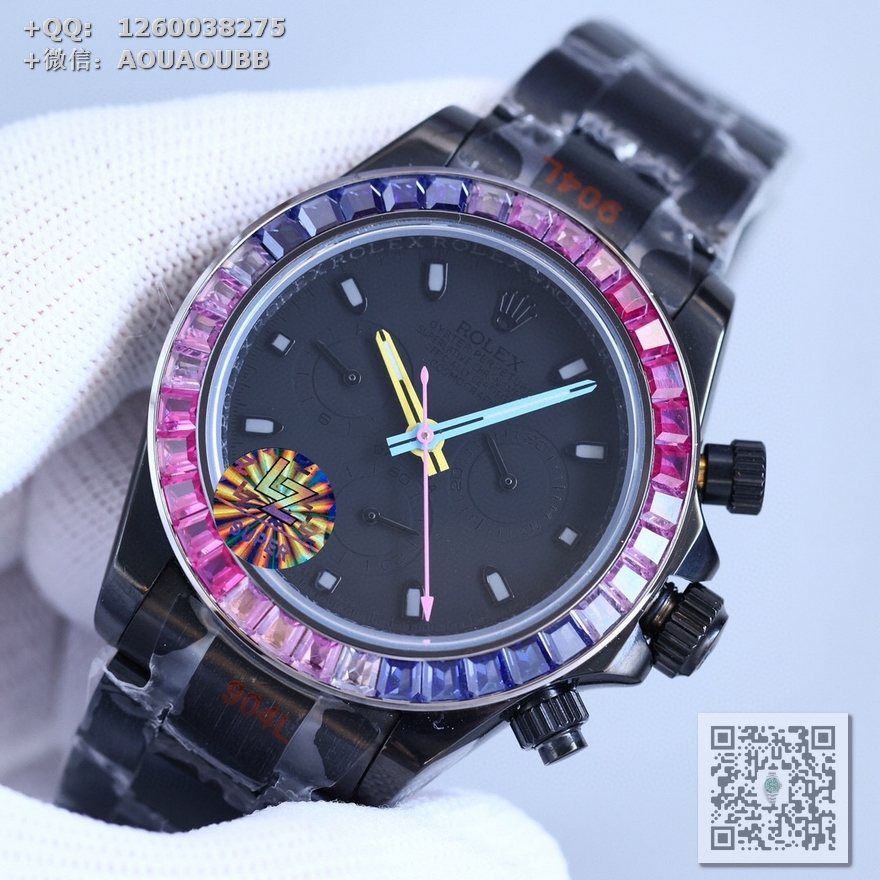表壳、表带采用904L精钢材质打磨,每个壳套全程CNC处理所有细节,再经过人工流程润饰,打磨和检测做工精细,圈口角度与宝石大小数量颜色跟专柜彩虹渐变效果一致!