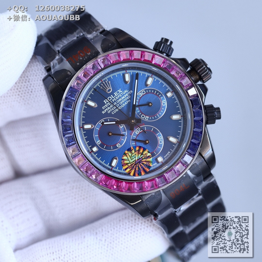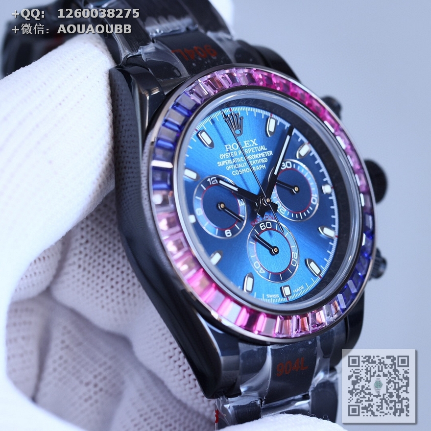 表壳、表带采用904L精钢材质打磨,每个壳套全程CNC处理所有细节,再经过人工流程润饰,打磨和检测做工精细,圈口角度与宝石大小数量颜色跟专柜彩虹渐变效果一致!