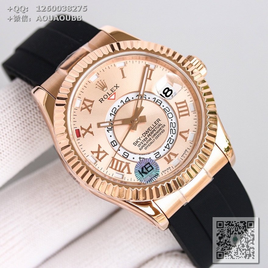【表壳】尺寸42MM,沉稳可靠、雍容大度!表圈采用劳力士Ring Command三角坑纹,旋转外圈可调转月份功能!抗刮损蓝宝石水晶,防反光凸透式放大日历窗