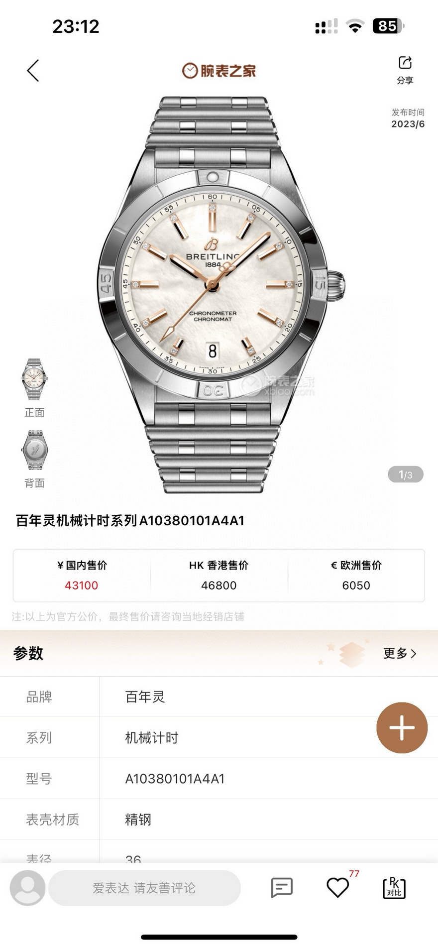 BLS最新高端精品 百年灵机械计时系列A10380101A4A1女士全自动机械腕表 搭载顶级进口2824机芯 直径36mm/厚度10mm