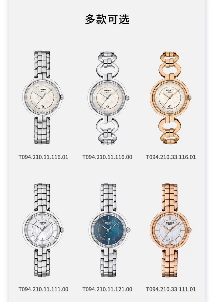 【产品介绍】原单专柜天梭最经典款式!天梭钢带款式!天梭t094系列石英腕表!佛拉明戈系列女士石英腕表!原装进口(F03.111-6H)瑞士机芯!非市面上朗达机芯。蓝宝石精钢表带!三针计时带日历!贝母表盘!生活防水!