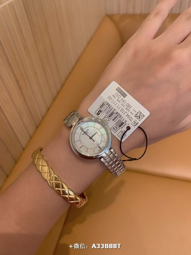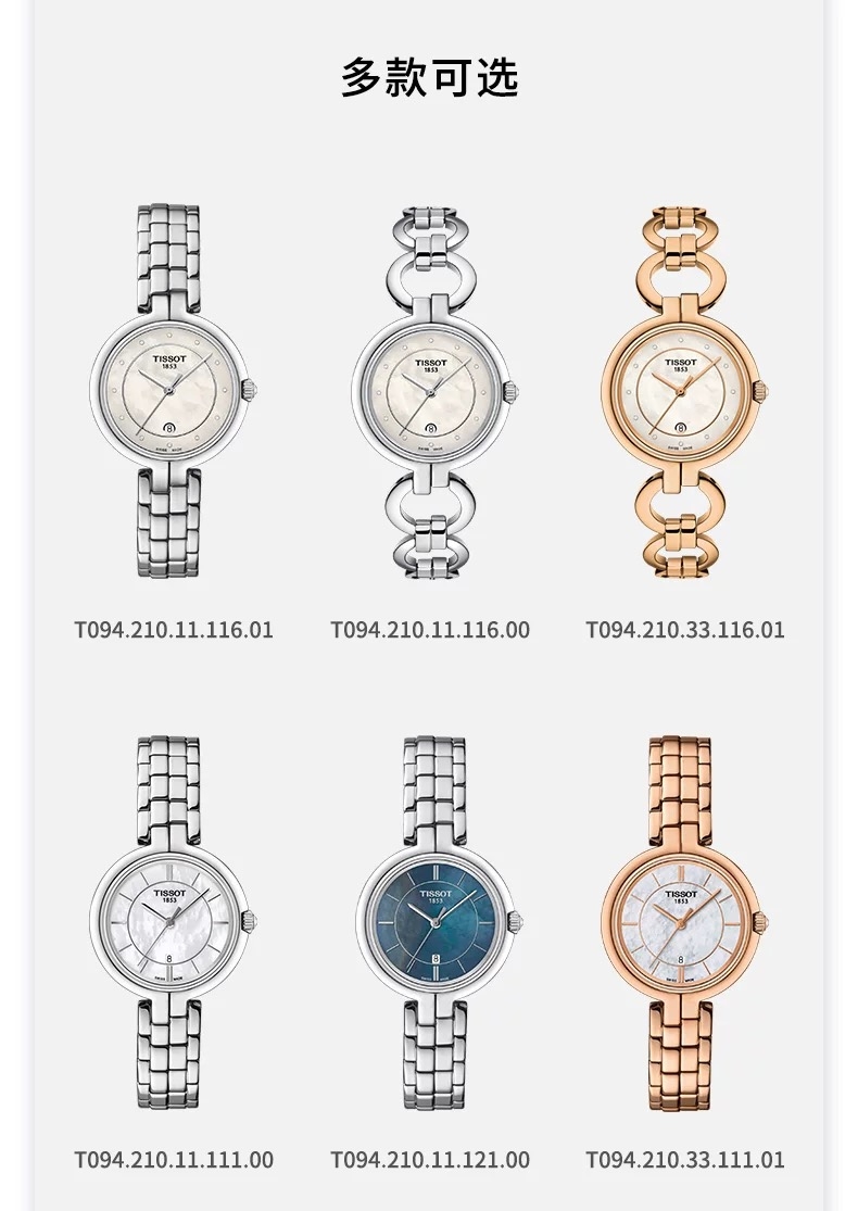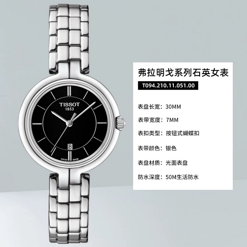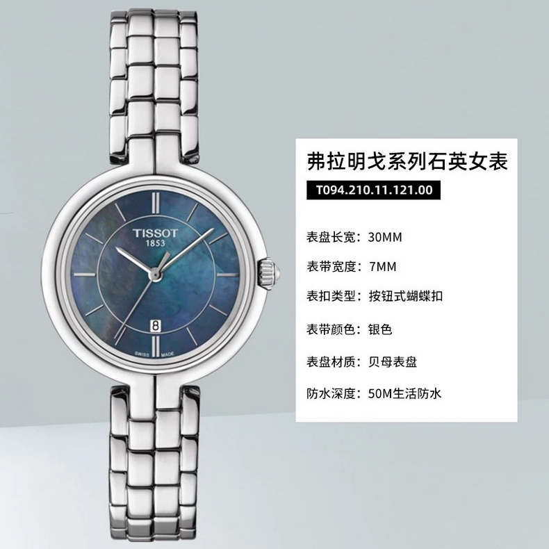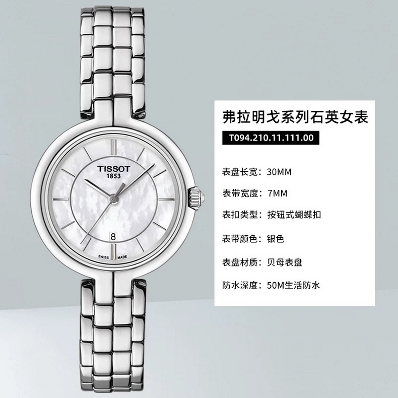 【品牌】天梭【产品介绍】原单专柜天梭最经典款式!天梭钢带款式!天梭t094系列石英腕表!佛拉明戈系列女士石英腕表!原装进口(F03.111-6H)瑞士机芯!非市面上朗达机芯。蓝宝石精钢表带!三针计时带日历!贝母表盘!生活防水!【款式】女款【尺寸】直径30mm【表带】精钢表带【镜面】蓝宝石镜面【机芯】瑞士F03.111机芯【防水】50米【配件】原装盒,说明书,质保卡,吊牌,香港机打发票【品质检测】保证所有手表实物拍摄,所见即所得 , 手表发货前都会有严格检查测试,确保您收到的手表无质量问题