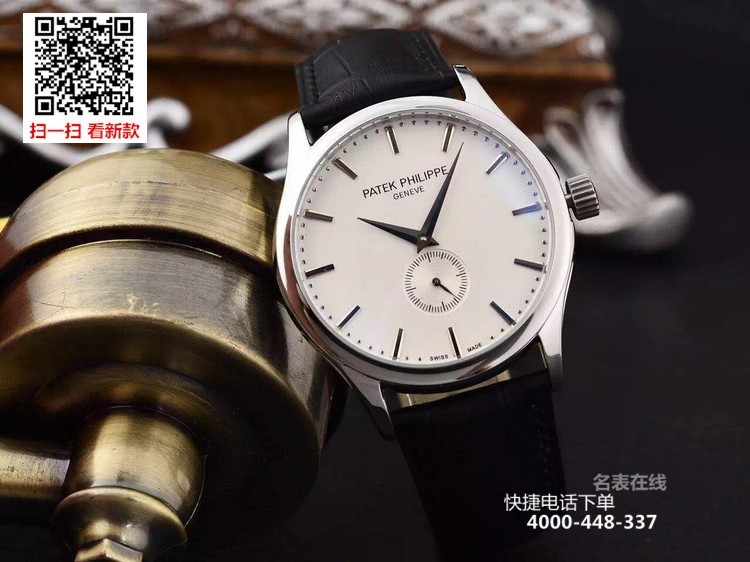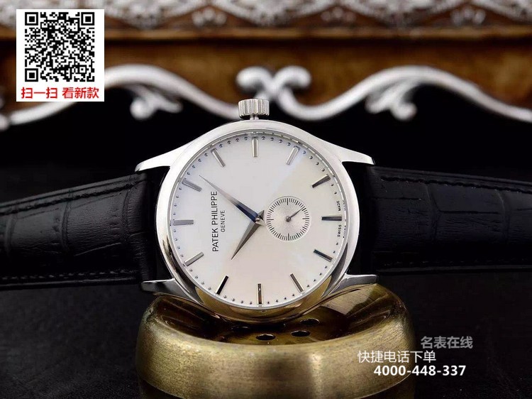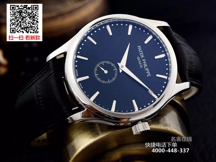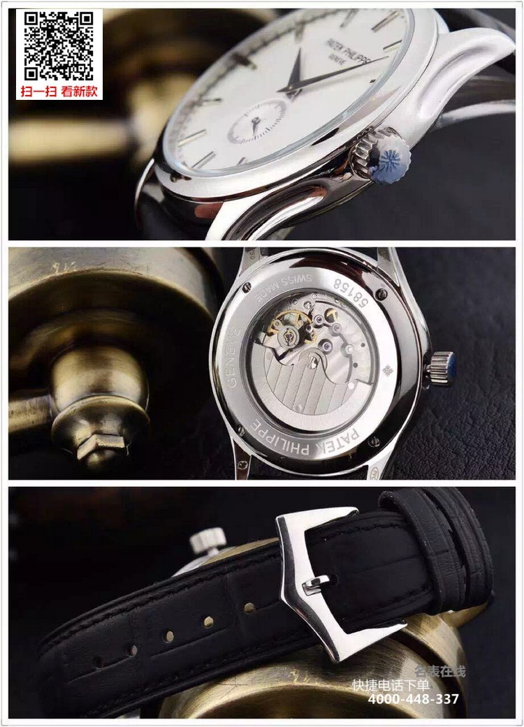 {品牌}:百达翡丽{款式}:男款{尺寸}:表壳直径约42mm ,厚度约10.5mm{表带}:真皮表带{镜面}:蓝宝石抗划镜面{机芯}:瑞士ETA全自动机芯{防水}:50米{配件}:原装盒,说明书,质保卡,吊牌,香港机打发票