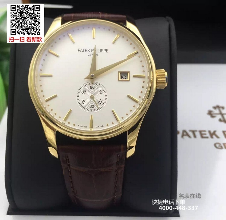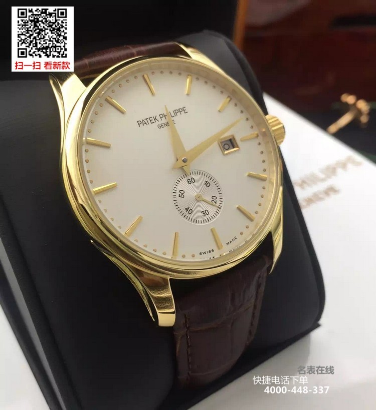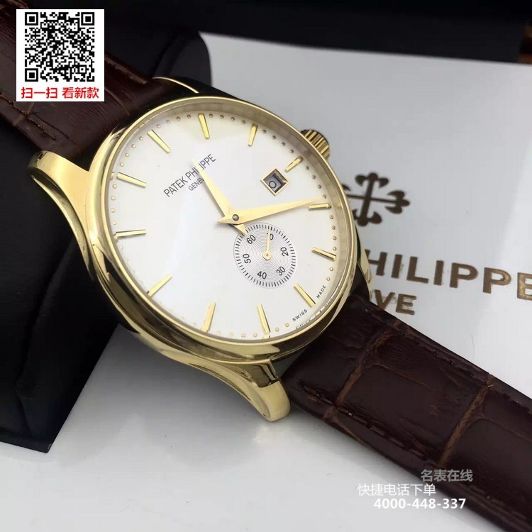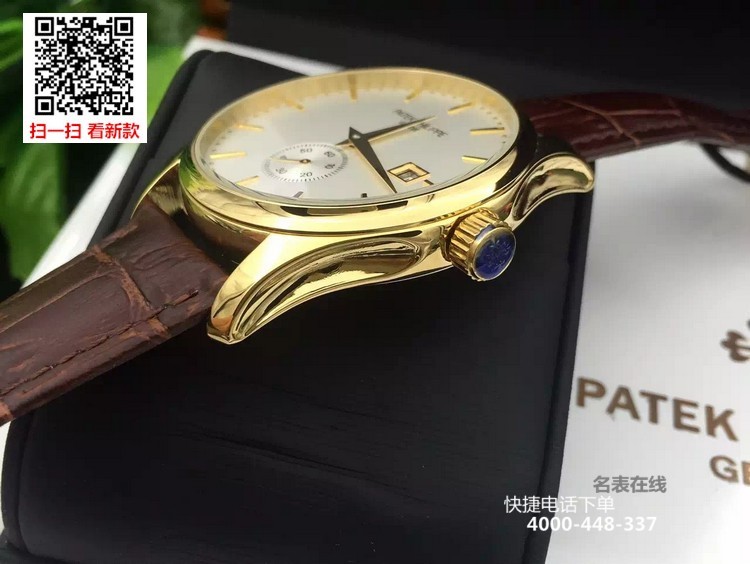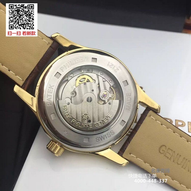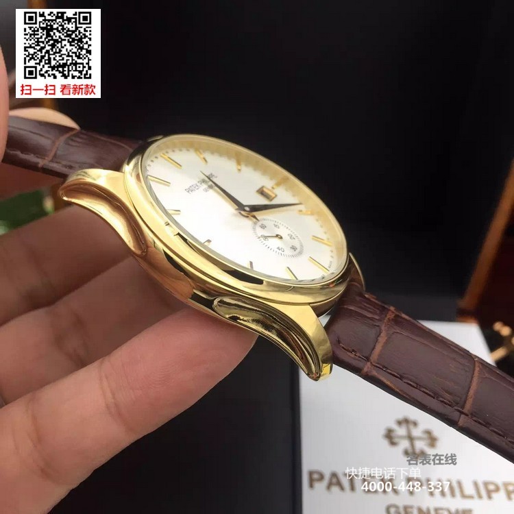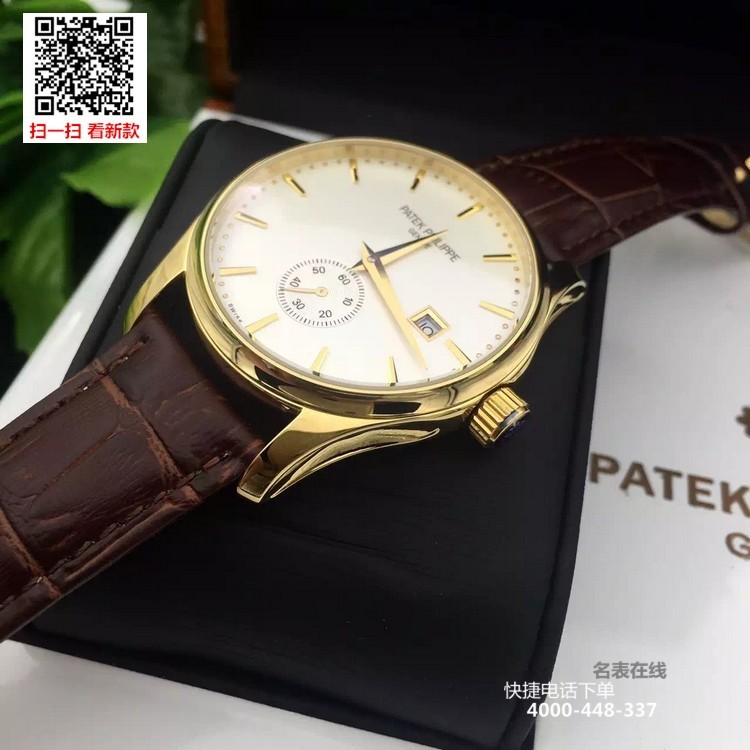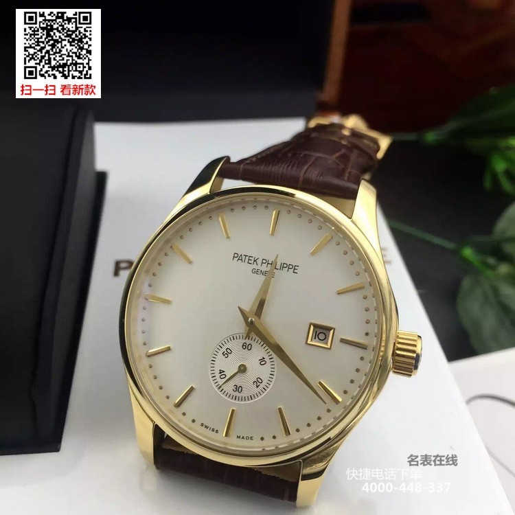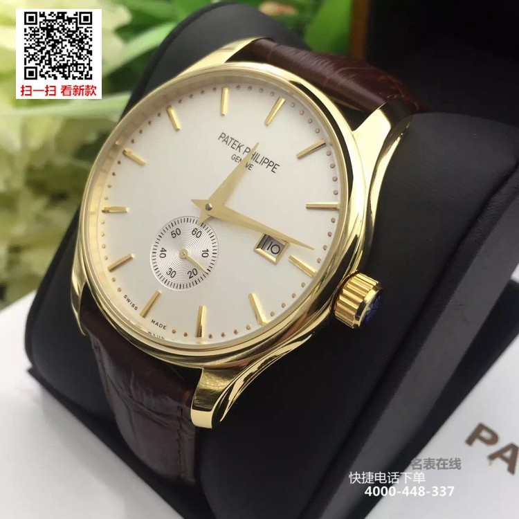 {品牌}:百达翡丽{款式}:男款{尺寸}:表壳直径约42mm ,厚度约10.5mm{表带}:真皮表带{镜面}:蓝宝石抗划镜面{机芯}:瑞士ETA全自动机芯{防水}:50米{配件}:原装盒,说明书,质保卡,吊牌,香港机打发票
