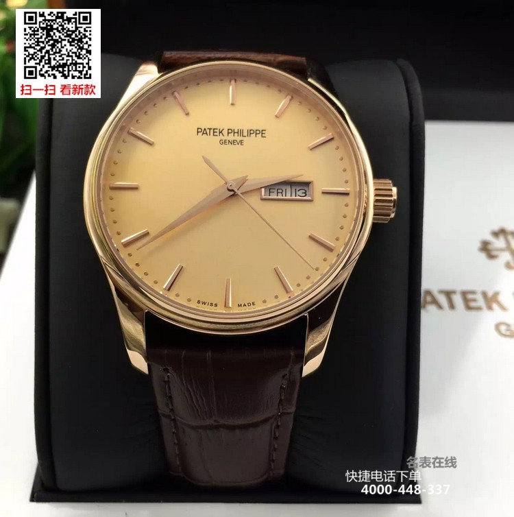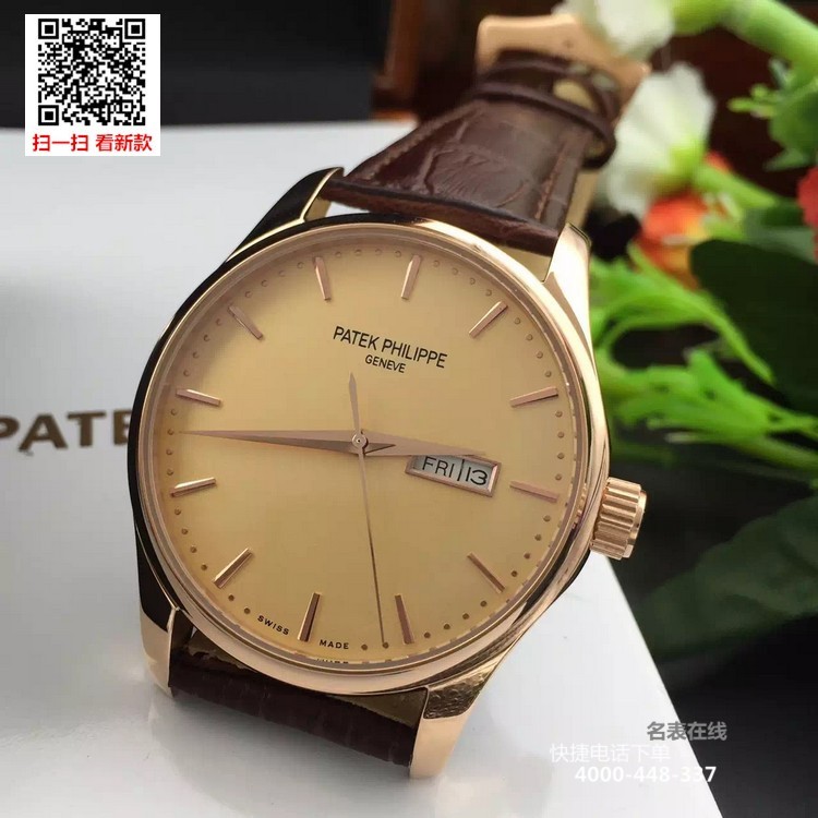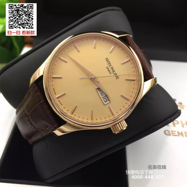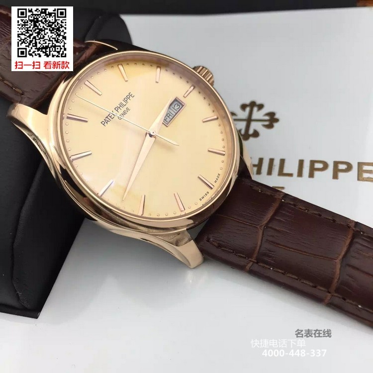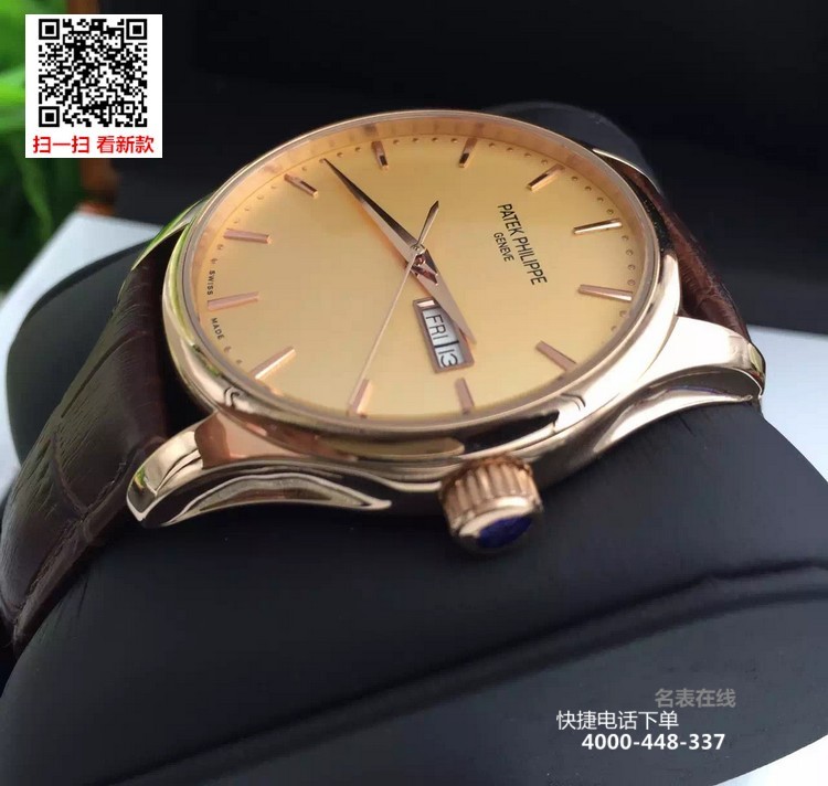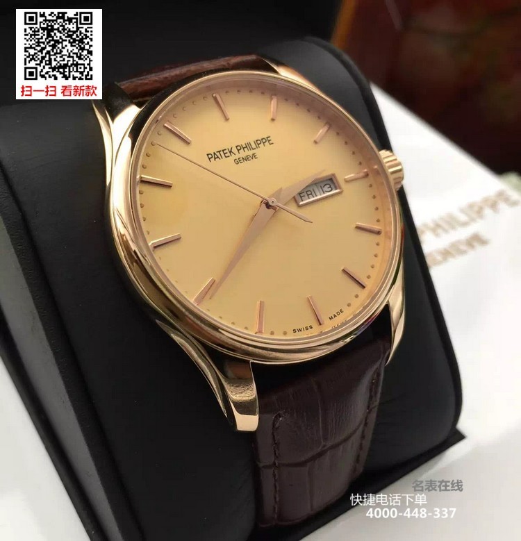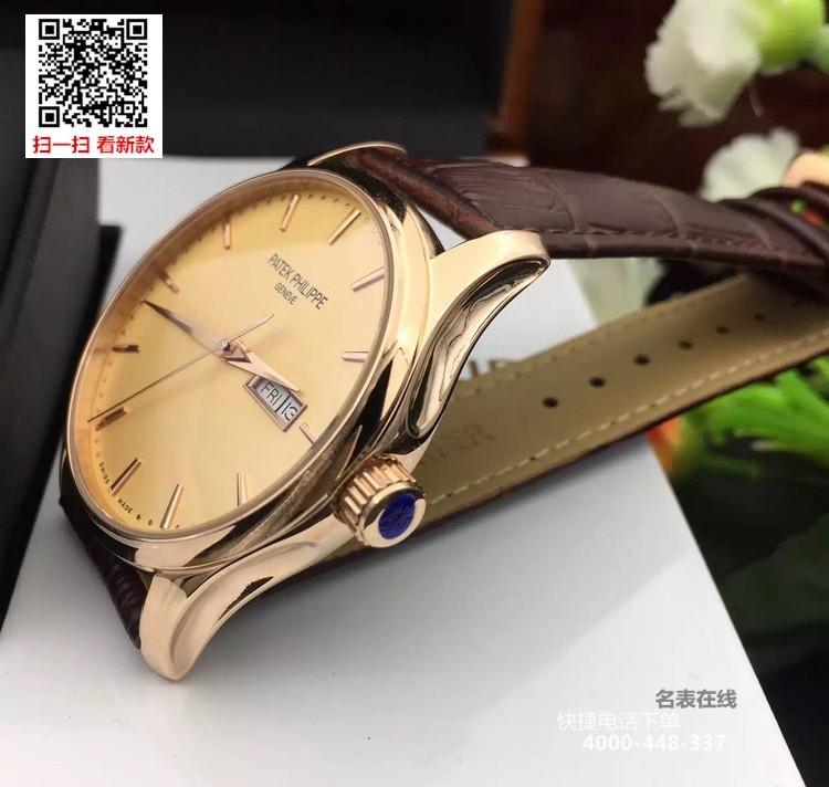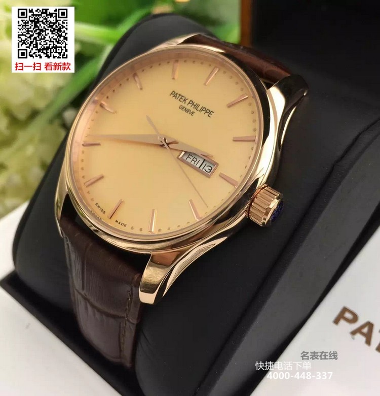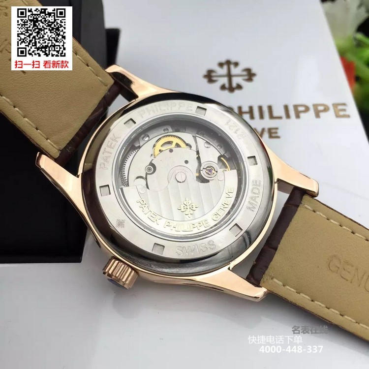 {品牌}:百达翡丽{款式}:男款{尺寸}:表壳直径约41.5mm ,厚度约11mm{表带}:真皮表带{镜面}:蓝宝石抗划镜面{机芯}:瑞士ETA全自动机械机芯{防水}:50米{配件}:原装盒,说明书,质保卡,吊牌,香港机打发票