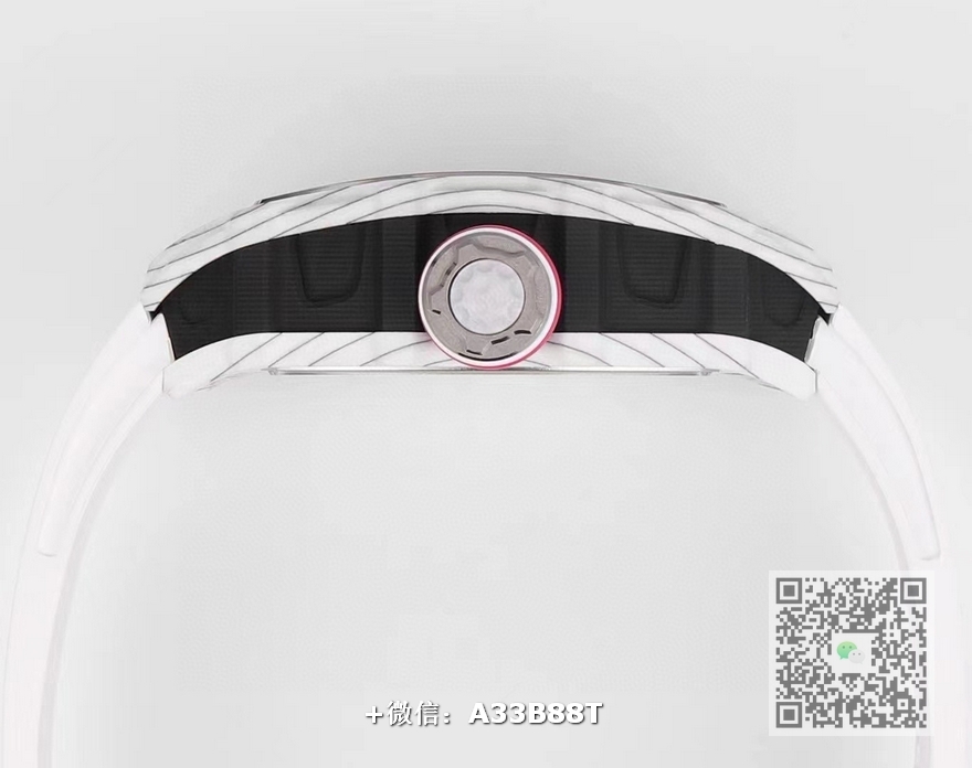 新作表圈和底盖采用粉色和白色石英碳纤维复合材料加工而成,中层表壳则以碳纤维和粉色石英碳纤维制成,每一个表壳都有独一无二的交错纹理。梯桶形表壳能够更舒适紧密的贴合手腕,表冠顶部巧妙模仿高尔夫球的凹凸造型,是颇为有趣的细节。