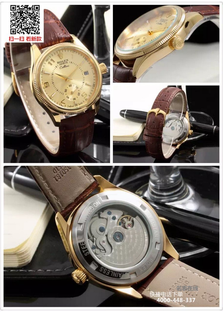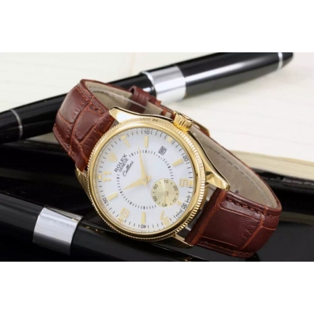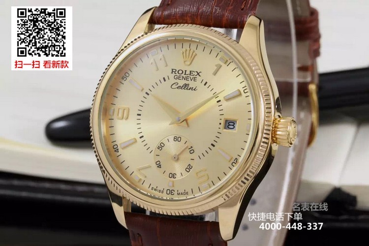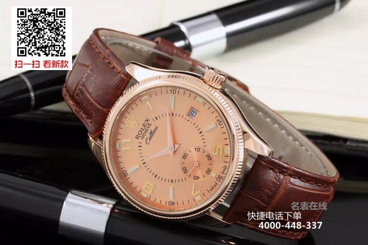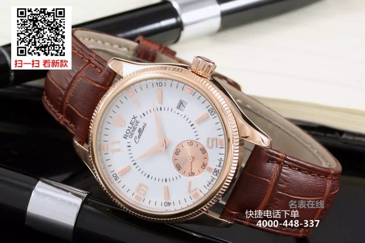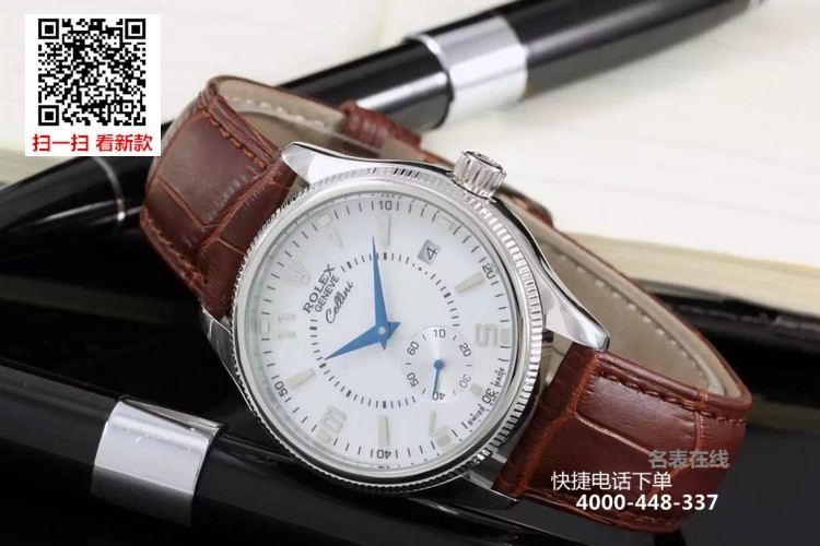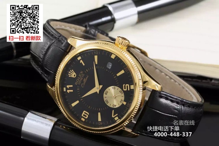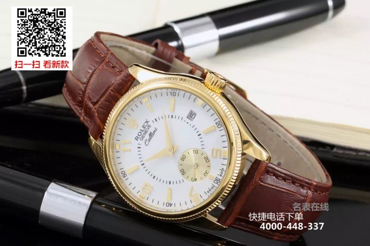 {品牌}:劳力士{款式}:男款{尺寸}:直径约39mm 厚度约11mm{表带}:真皮表带{镜面}:蓝宝石抗划镜面{机芯}:瑞士ETA全自动机械机芯{防水}:50米{配件}:原装盒,说明书,质保卡,吊牌,香港机打发票