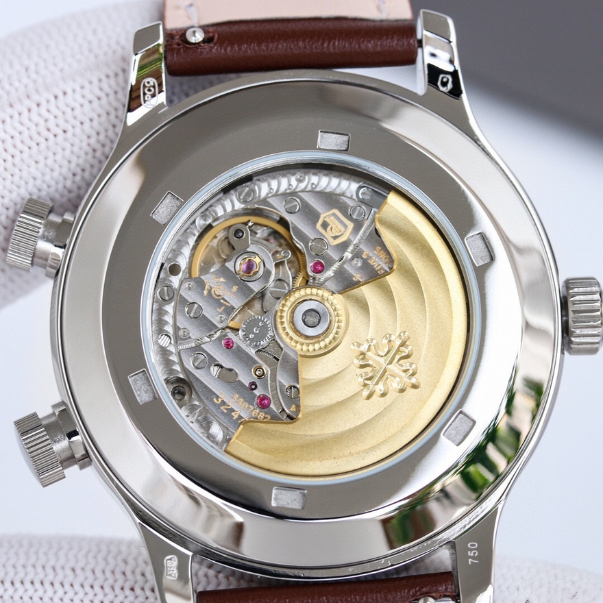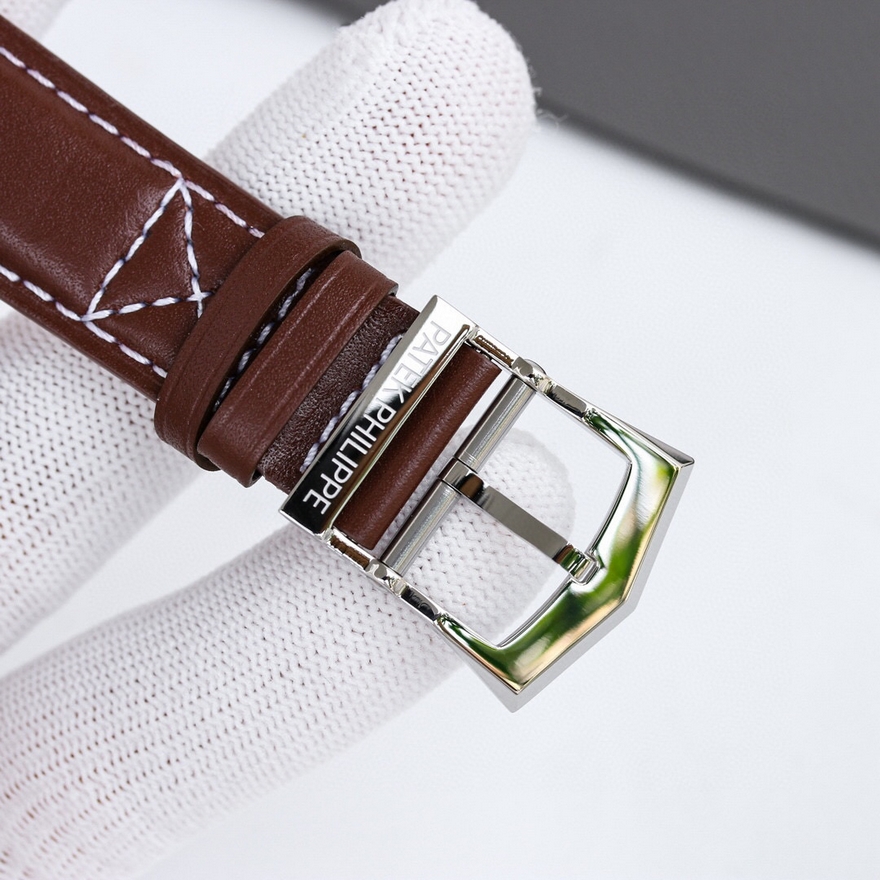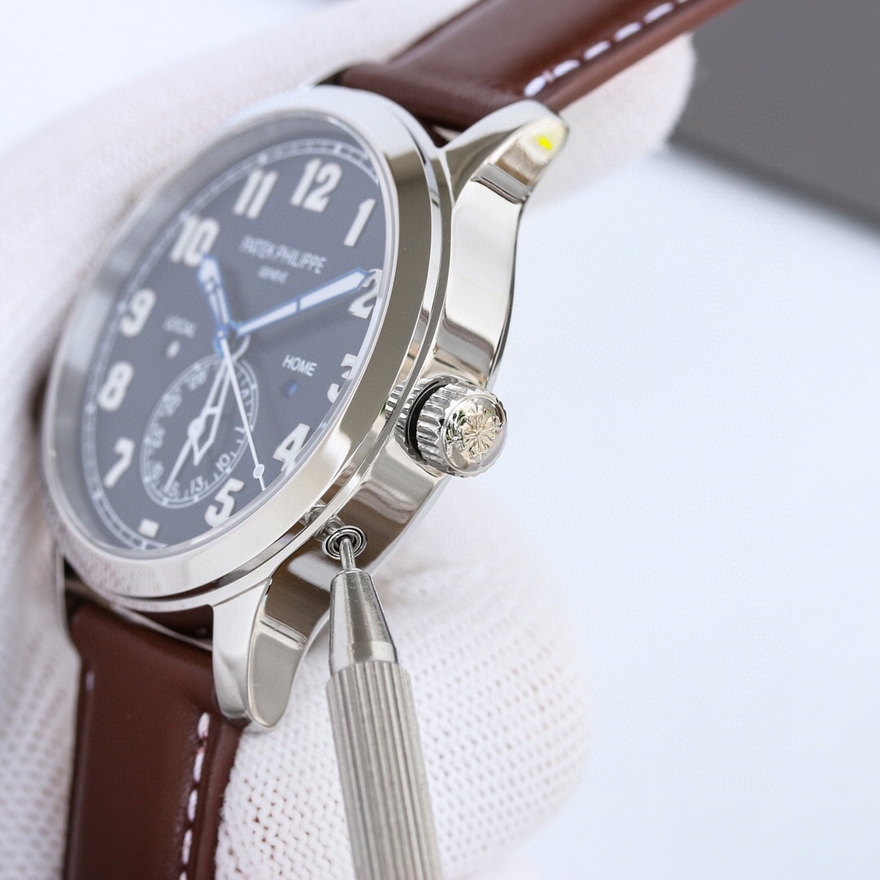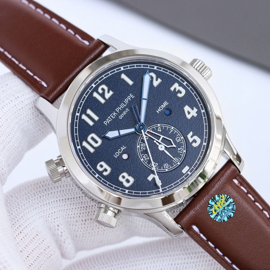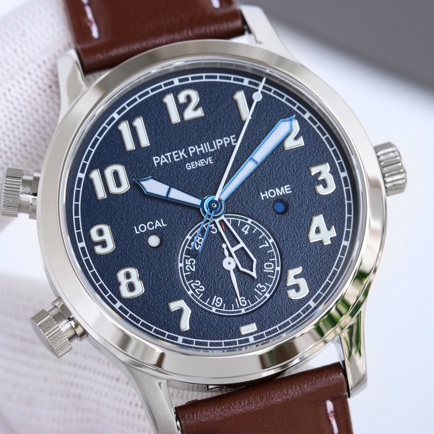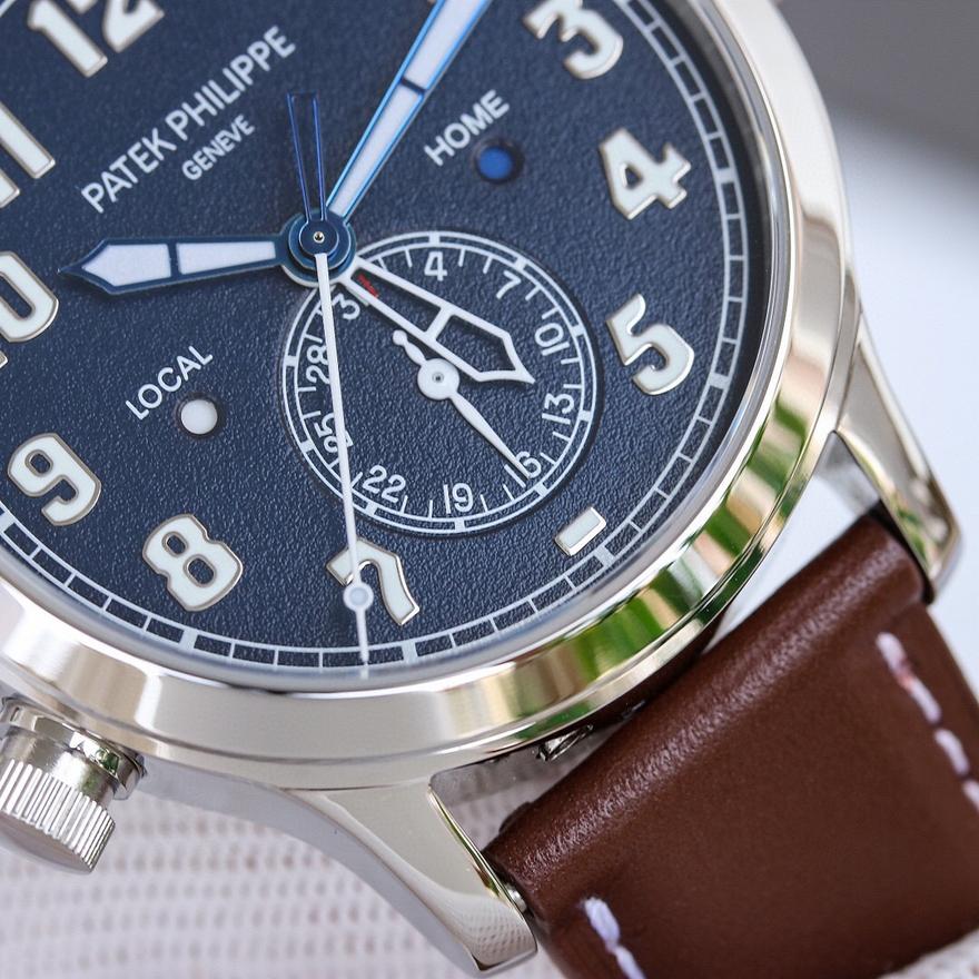 【产品介绍】 ZF新品 PP百达双时区功能ref.5524 Calatrava飞行家旅行时间腕表系列惊艳登场! 【表盘】玫瑰金咖啡表盘和深蓝色涂漆表盘,表面有哑光颗粒质感、精致内敛,阿拉伯荧光涂层字体也同正品一致有立体感,将飞行表易读粗旷的风格渲染到极致。 【表壳】同正品一致壳身为42毫米、厚度为11毫米、做工方面也继承百达翡丽的一贯作风、壳身完全镜面抛光处理,光滑细腻、增强其视觉感、在细节方面做到极致。 【功能】5524系列为二十四小时制时间腕表,六位同正品一致是日历,中心大秒针底部则为双时区时间显示 与正品一致。 【机芯】复刻原版324SC FUS机芯、自动上链装置适合每天佩戴,从背部蓝宝石透视底看能让你一览无遗尽收眼底。一只最实用的商旅手表于焉诞生。 【表带集表扣】扣子使用与原装一致的三角型针扣,佩戴方便,与表壳相呼应,展现此腕表的整体美学。搭配蓝色皮表带,并以米色缝线装点,质感舒适,牛皮也让整款腕表更有复古味道。 做为首款PP飞行员腕表,42尺寸也是尽现硬汉气派,同时也是一款运动风格腕表,更是商旅人士的理想腕上伴侣。