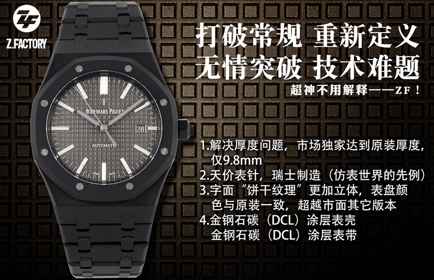 【产品介绍】ZF出品 再攀新高 推出15400系列“DLC版本”高亮黑的金钢碳镀层既保留了整表的磨砂质感又增加了暗黑的层面。关于手表的品质还是一如既往的好!1️⃣采用9015机芯改爱彼CAL.3120一体机!实现厚度达到9.8mm与原装一样(市面其他版本最薄的在11mm左右)2️⃣.天价表针 瑞士制造(开仿表界先例):等价黄金的表针其光泽度,形状,立体感和夜光。效果可以秒杀现在所有仿品【修正主要细节】1️⃣.表盘“Audemars Piguet”与表盘是呈现凸起状,而非持平状态。2️⃣.ZF通过提升成从而提升技术,把日历的字体做到极致。3️⃣.各位可以对比一下现在市面的所有版本,会发现ZF表盘上的“饼干纹理”更佳立体。饼干纹上的细纹十分精妙。表盘颜色也可傲视群雄!4️⃣.钢带头粒的“缓冲带”致敬原装,松紧的感觉一模一样。这也是尝试了无数次的结果。5️⃣.钢带扣上的AP字印LOGO是可以微微活动的,品味原装的细节,才能体现精髓。6️⃣.超级自动陀,颜色于原装一致(市面一般版本均偏红)其上的ap家族徽章浮雕也更加精致润泽。超神不用解释——ZF 15400 DLC版现正式发布!