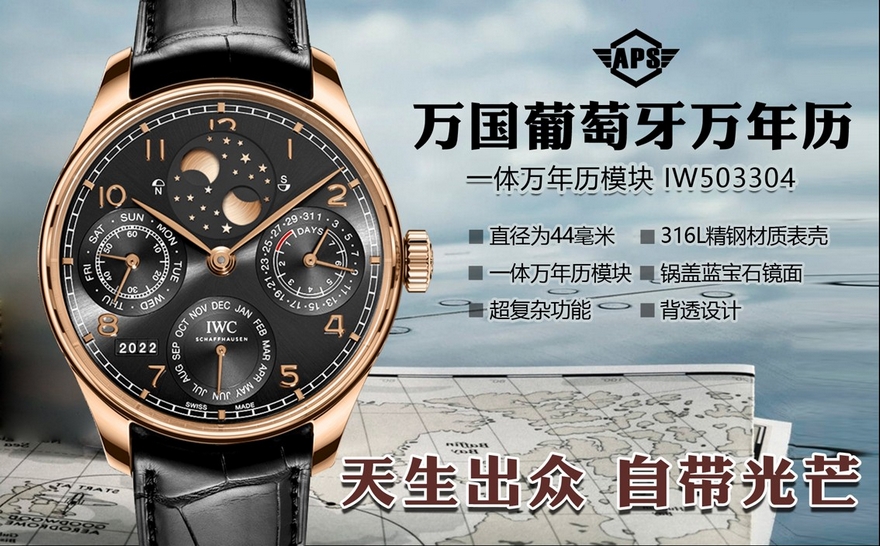 【产品介绍】 APS新品  万国葡萄牙系列万年历腕表,复刻界最复杂的腕表,所有功能同步原装,所有功能调节通过把头控制