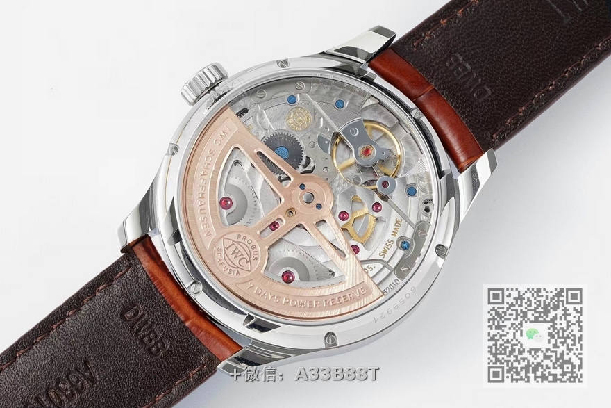 【机芯性能】尺寸44.2mmX14.9mm,基础机芯采用葡七基础机芯,高效稳定,动力时间长达72小时以上,加装复杂的万年历模块,而且同步原装所有功能实现同步原装通过把头调节